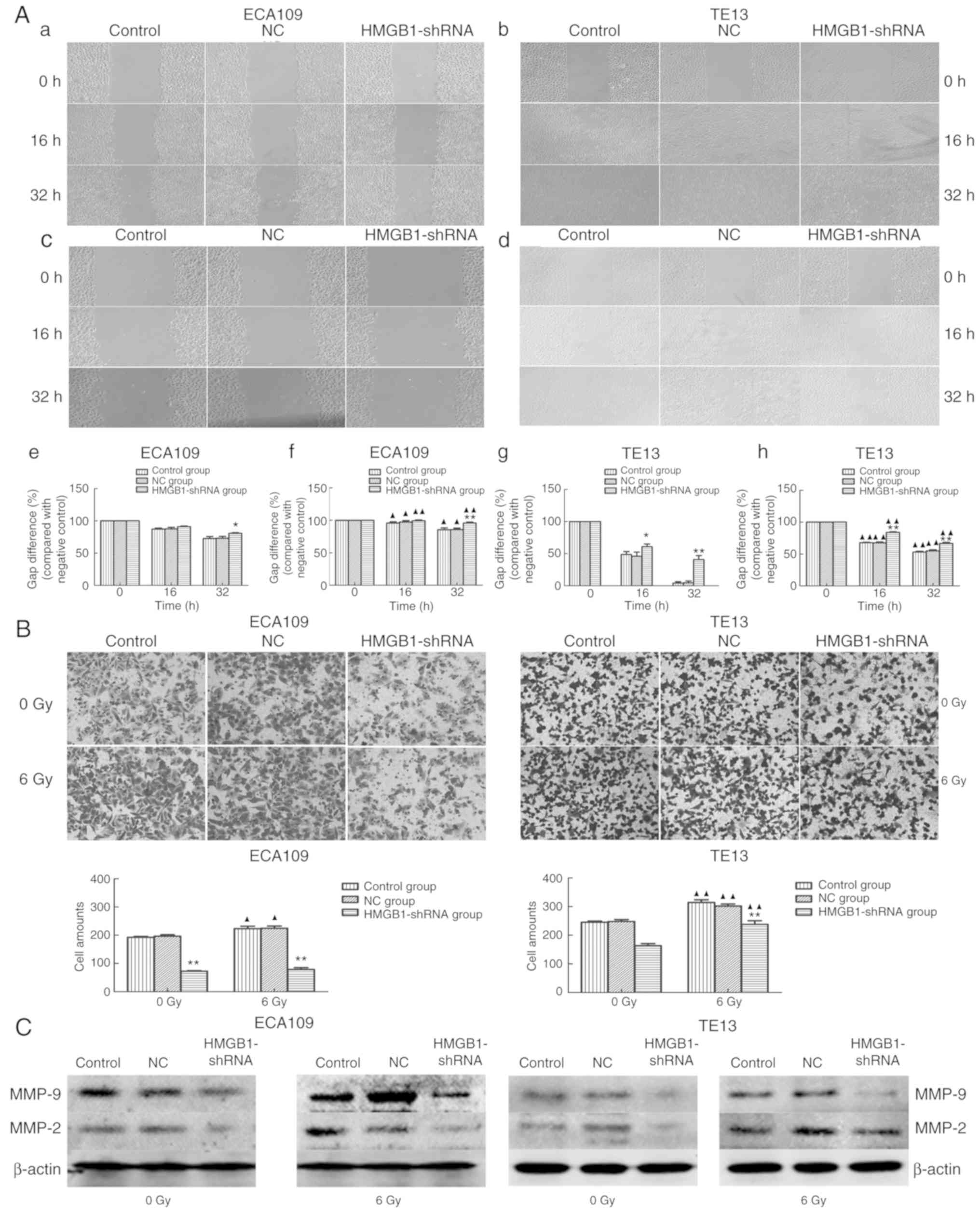 To observe the migration and invasion abilities of esophageal carcinoma cells, a wound-healing experiment and Transwell assay, respectively, were applied to ECA109 and TE13 cells. The results revealed that blocking the expression of HMGB1 significantly decreased the migration activity of ECA109 and TE13 cell lines both with (Fig. 3Ac, d, f and h) and without irradiation (Fig. 3Aa, b, e and g). In addition, the invasive ability of esophageal carcinoma cells transfected with HMGB1-shRNA was significantly inhibited compared with those of the control and NC groups (P<0.05) both with and without irradiation (Fig. 3B). These results indicated that HMGB1 deficiency decreased the migration and invasion abilities of esophageal tumor cells. Furthermore, to analyze the potential mechanism underlying the HMGB1-shRNA-mediated blockade of invasion and migration, MMP-2 and MMP-9 protein expression was examined, and the expression levels of both were reduced in the HMGB1-shRNA group before and after irradiation in comparison to those of the control and NC groups (Fig. 3C).