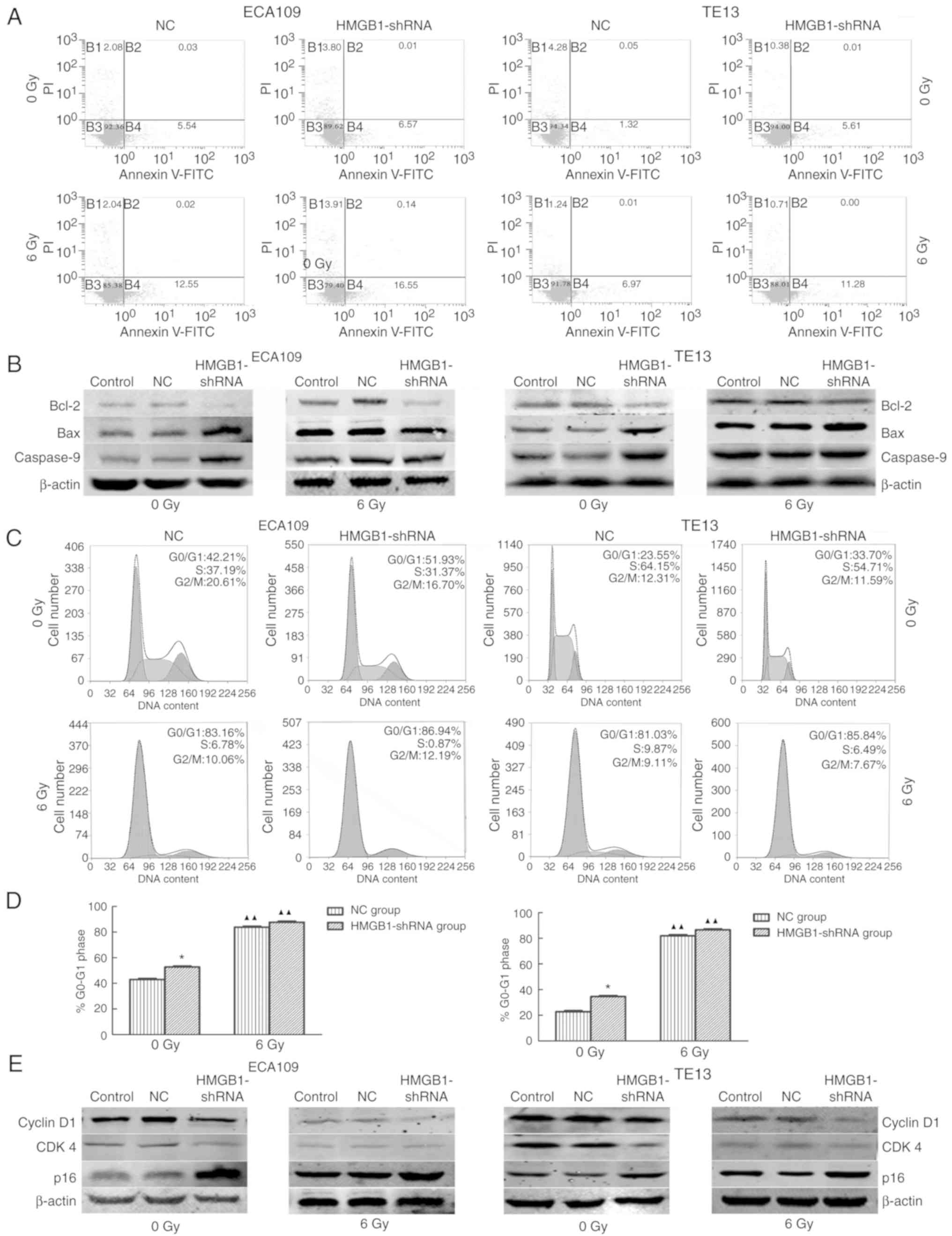 According to flow cytometric results, silencing of HMGB1 caused G0/G1 arrest of esophageal carcinoma cells with and without irradiation (Fig. 4C and D). A western blot assay that explored the expression levels of proteins related to the cell cycle revealed downregulation of cyclin D1 and CDK4 and upregulation of p16 in the HMGB1-shRNA groups with and without irradiation compared with the levels in the NC group (Fig. 4E). The cyclin D1 expression was lower in the irradiated group than the non-irradiated group. Furthermore, cyclin D1 expression was significantly decreased in the HMGB1-shRNA group with irradiation treatment. These data demonstrated that suppressing the expression of HMGB1 arrested esophageal tumor cells in the G0/G1 phase by upregulating the expression of p16 and decreasing the expression cyclin D1 and CDK4.