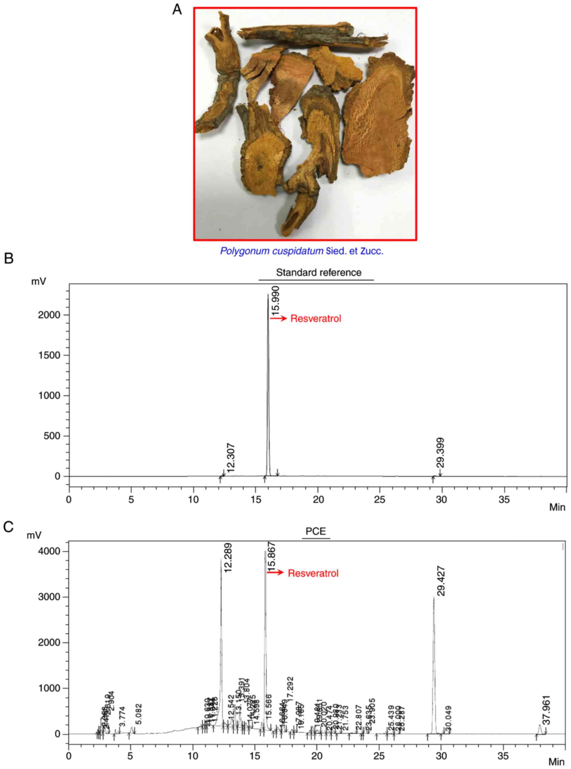 Dried Polygonum cuspidatum Sieb. et Zucc. (Fig. 1A) was obtained from a traditional Chinese medicine drugstore in Taichung, Taiwan. The sample was powdered to a homogeneous size through a 60-mesh filter in a mill and then sieved. The powder (100 g) was extracted twice by 75% ethanol for 60 min under reflux at room temperature. The ethanol extract of P. cuspidatum (PCE) was obtained by combining the filtrates dried in a vacuum at 45°C, and then collecting 40.32 g of brownish viscous residue, as previously described (29). The analysis was carried out via high-performance liquid chromatography (HPLC) analysis, as previously described (30,31), using a Shimadzu LC-20A system consisting of a CBM-20A HPLC pump, a FRC-10A autosampler, UV and PDA detectors, and Merck Purospher STAR RP-18 end-capped 250–4.6 mm (5 µm) column. Chromatograms were monitored at 280 nm using a UV detector. H2O (containing 0.2% formic acid) was used as solvent A and acetonitrile was used as solvent B. Following the injection of 10 µl of the sample, the flow rate of the mobile phases was maintained at 1 ml/min. A linear HPLC gradient was employed: i) 0.0–10.0 min linear gradient from 10 to 40% of solvent B; ii) 10.0–32.0 min linear gradient from 40 to 85% of solvent B; iii) 32.0–40.0 min isocratic at 85% of solvent B. Furthermore, the PCE was re-suspended and dissolved in dimethyl sulfoxide (DMSO) and used for further in vitro experiments.