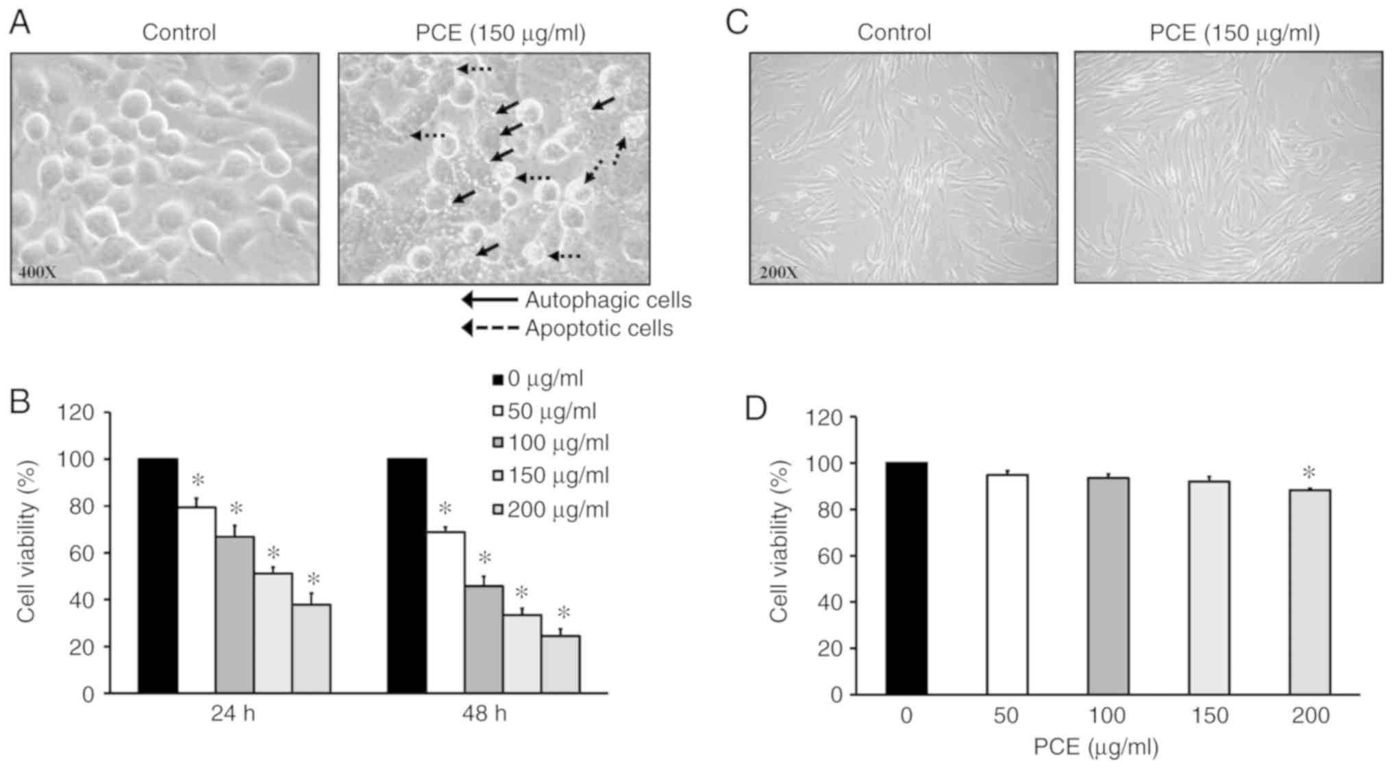 PCE promoted the formation of autophagic vacuoles and apoptotic bodies after exposure to 150 µg/ml PCE for 24 h in CAR cells (Fig. 2A). PCE also reduced viable CAR cells in a time- and concentration-dependent manner (Fig. 2B). These findings indicated that autophagy and apoptotic mechanisms may be present in PCE-treated CAR cells. Notably, no morphological changes (Fig. 2C) and cytotoxic effects (Fig. 2D) were found on normal HGF cells. Thus, PCE exerted lower cytotoxicity in normal oral cells and triggered autophagic and apoptotic mechanisms in CAR cells.
