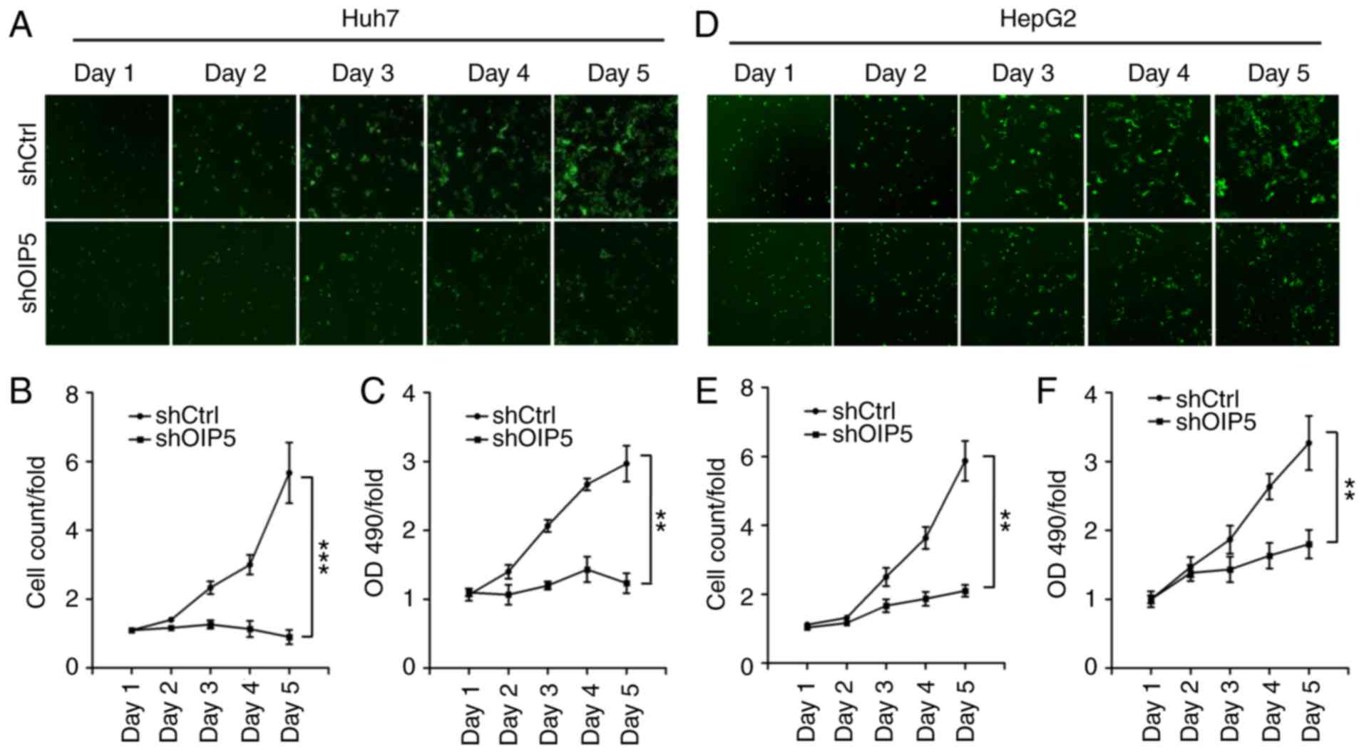 As depicted in Fig. 4A, and determined by quantification in Fig. 4B, the number of Huh7 cells transfected with pGCSIL-shCtrl lentivirus significantly increased over the 5 days of observation, while the number of pGCSIL-shOIP5-transfected Huh7 cells remained almost the same. The proliferation activity was examined using an MTT assay and expressed as optical density 490 nm. As depicted in Fig. 4C, the proliferative effect of Huh7 cells transfected with pGCSIL-shCtrl was increased, compared with Huh7 cells transfected with pGCSIL-shOIP5 (P<0.01). Additionally, the results were further confirmed in HepG2 cells (Fig. 4D-F). These data indicated that the proliferation of Huh7 or HepG2 cells could be significantly suppressed by OIP5 knockdown.