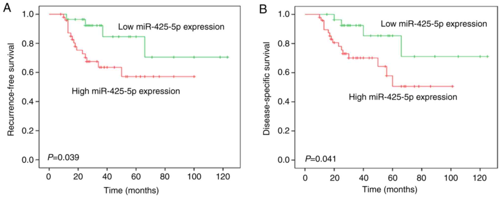 Table I.Association between miR-425-5p and clinicopathological features of patients with breast cancer. |