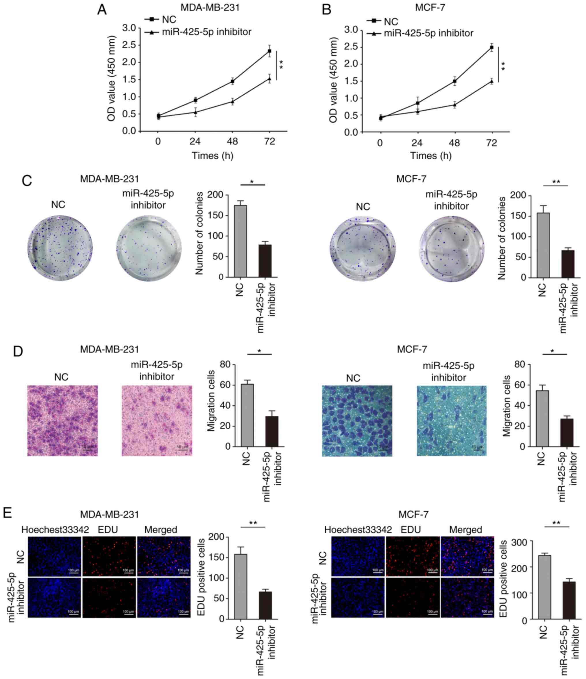 Among the BC cell lines, the expression of miR-425-5p was lowest in MCF-7 cells and highest in MDA-MB-231 cells (Fig. 1B). Therefore, these two cell lines were selected for subsequent experiments. To investigate the biological role of miR-425-5p on proliferation of BC cells, CCK-8 assays showed that knockdown of miR-425-5p expression significantly inhibited MDA-MB-231 and MCF-7 cell proliferation (Fig. 3A and B). Colony formation assays also revealed that reducing the expression of miR-425-5p resulted in reduced colony number in MDA-MB-231 and MCF-7 cells (Fig. 3C). Transwell assays indicated that knockdown of miR-425-5p inhibited migration in MDA-MB-231 and MCF-7 cells (Fig. 3D). However, knockdown of miR-425-5p had no significant effect on the invasive ability of MDA-MB-231 and MCF-7 cells (Fig. S1). Moreover, decreased miR-425-5p expression significantly inhibited EdU uptake, representing the proliferation of cells, in MDA-MB-231 and MCF-7 cells (Fig. 3E).