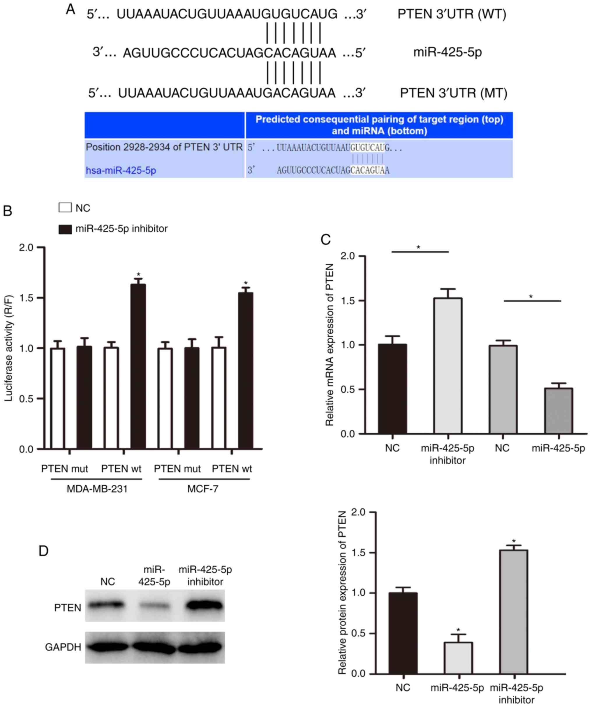 The online miRNA databases Oncomir (http://www.oncomir.org/), MiRanda (http://www.microrna.org/microrna/home.do), miRWalk (http://mirwalk.umm.uni-heidelberg.de/) and TargetScan (http://www.targetscan.org) were used to identify downstream target genes of miR-425-5p. The wild-type (WT) PTEN 3′ 3′UTR and mutant (MUT) PTEN 3′UTR oligonucleotides containing the putative binding site of miR-425-5p were cloned into the firefly luciferase-expressing pMIR-REPORT vector (Obio Technology Corp., Ltd.). These constructs were co-transfected with inhibitor NC or miR-425-5p inhibitor into MCF-7 and MDA-MB-231 cells. After 48 h of transfection, luciferase activity was determined using the Dual-Luciferase Reporter Assay kit (Promega Corporation) according to the manufacturer's protocol. The ratio of Renilla luciferase activity to firefly luciferase activity was calculated.