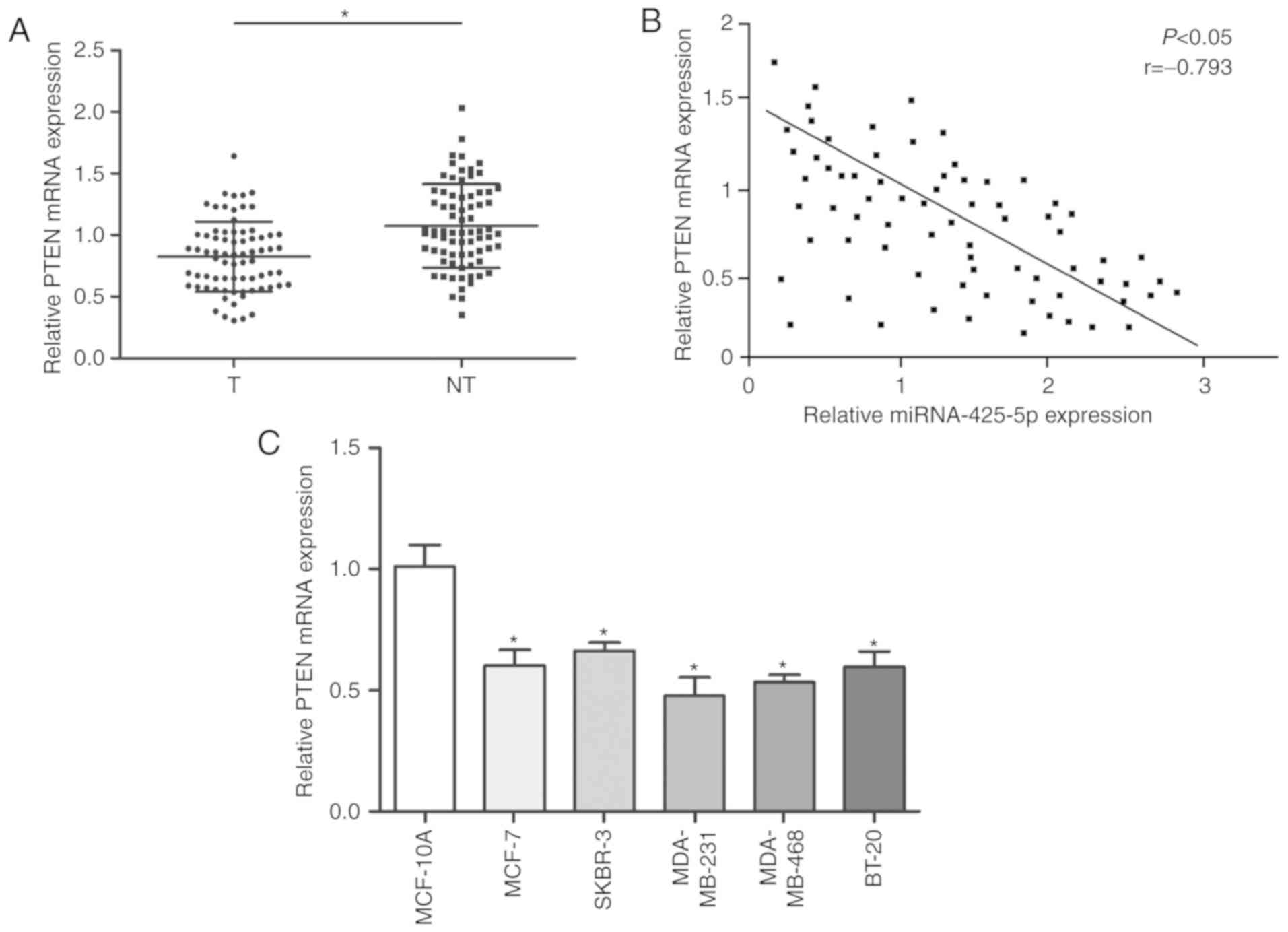 Furthermore, PTEN mRNA was lower in BC tissues compared with that in paired adjacent tissue (Fig. 5A). PTEN mRNA expression levels inversely correlated with expression of miR-425-5p (Fig. 5B). Similarly, the expression of PTEN was found to be lower in BC cells compared with normal mammary epithelial cells (Fig. 5C).
