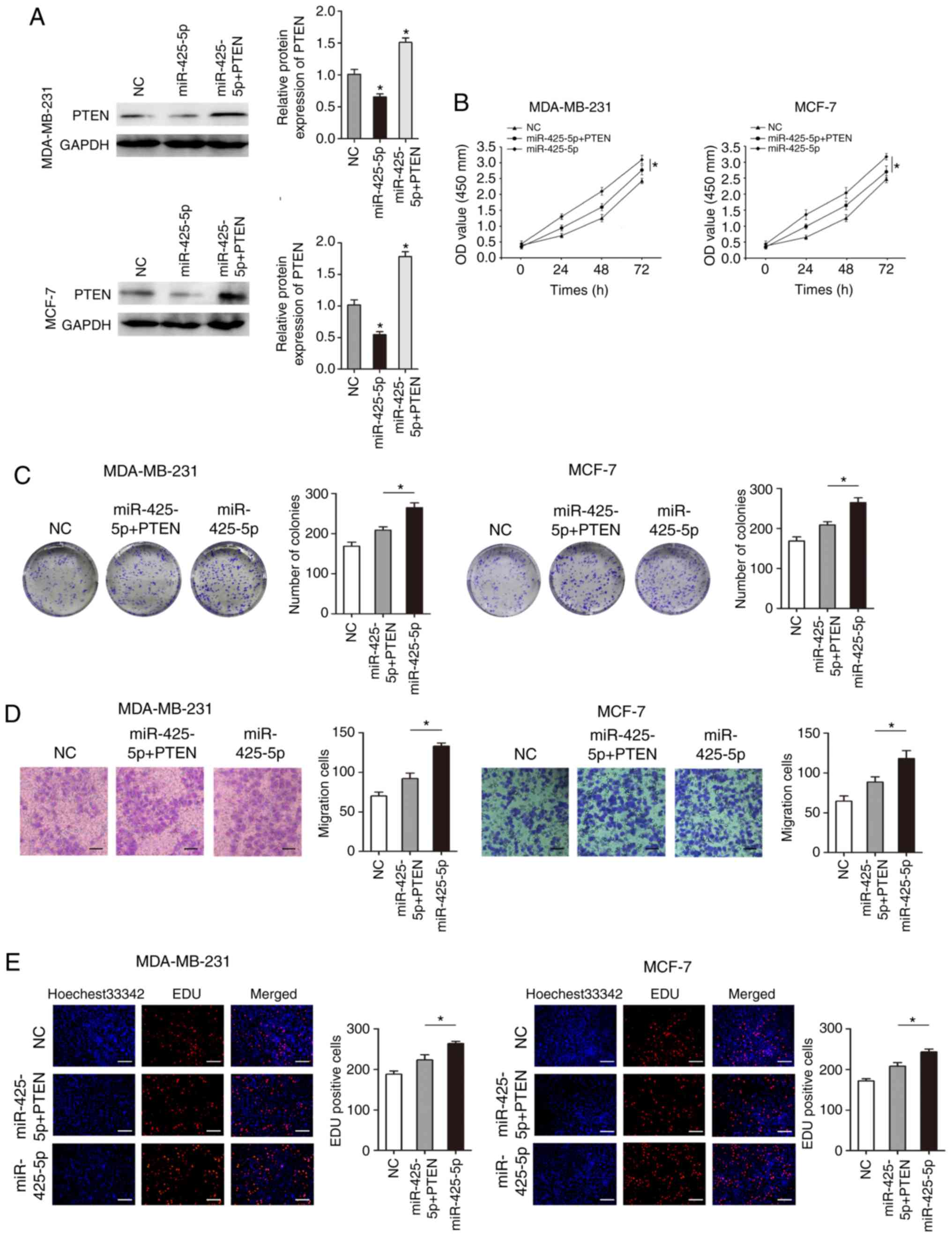 To further confirm that PTEN is a functional target gene of miR-425-5p, the expression of PTEN was restored by transfecting MDA-MB-231 and MCF-7 cells with a PTEN-containing plasmid (pcDNA-PTEN). Overexpression of PTEN compared to controls (untransfected cells and empty vector) was confirm by RT-qPCR(Fig. S3). Co-transfection with pre-miR-425-5p and pcDNA-PTEN resulted in increased PTEN protein levels (Fig. 6A). Overexpression of miR-425-5p significantly promoted cell proliferation and migration in MDA-MB-231 and MCF-7 (Fig. 6B-E). Overexpression of PTEN significantly inhibited the promotional effects of miR-425-5p on proliferation and migration in MDA-MB-231 and MCF-7 cells (Fig. 6B-E). These results suggest that miR-425-5p plays a biological role through PTEN.
