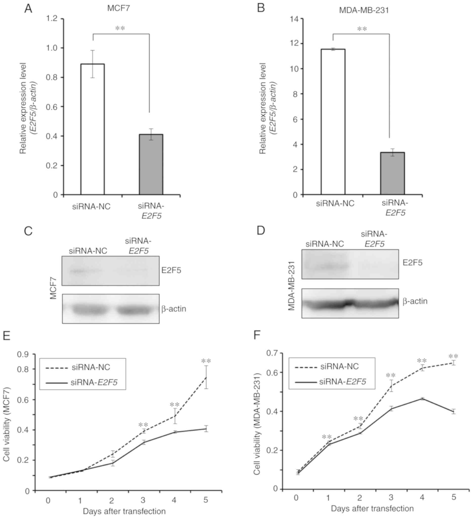 siRNA-mediated knockdown of E2F5 in MCF7 and MDA-MB-231 cells was then performed. Under the experimental conditions, E2F5 mRNA and protein expression levels were efficiently downregulated in MCF7 (Fig. 2A and C) and MDA-MB-231 cells (Fig. 2B and D). Next, the possible effects of E2F5 downregulation on cell proliferation were examined. As revealed in Fig. 2E and F, downregulation of E2F5 expression caused a significant decrease in the proliferation rates of MCF7 and MDA-MB-231 cells, indicating that E2F5 may regulate proliferation of breast cancer cells regardless of their subtype.