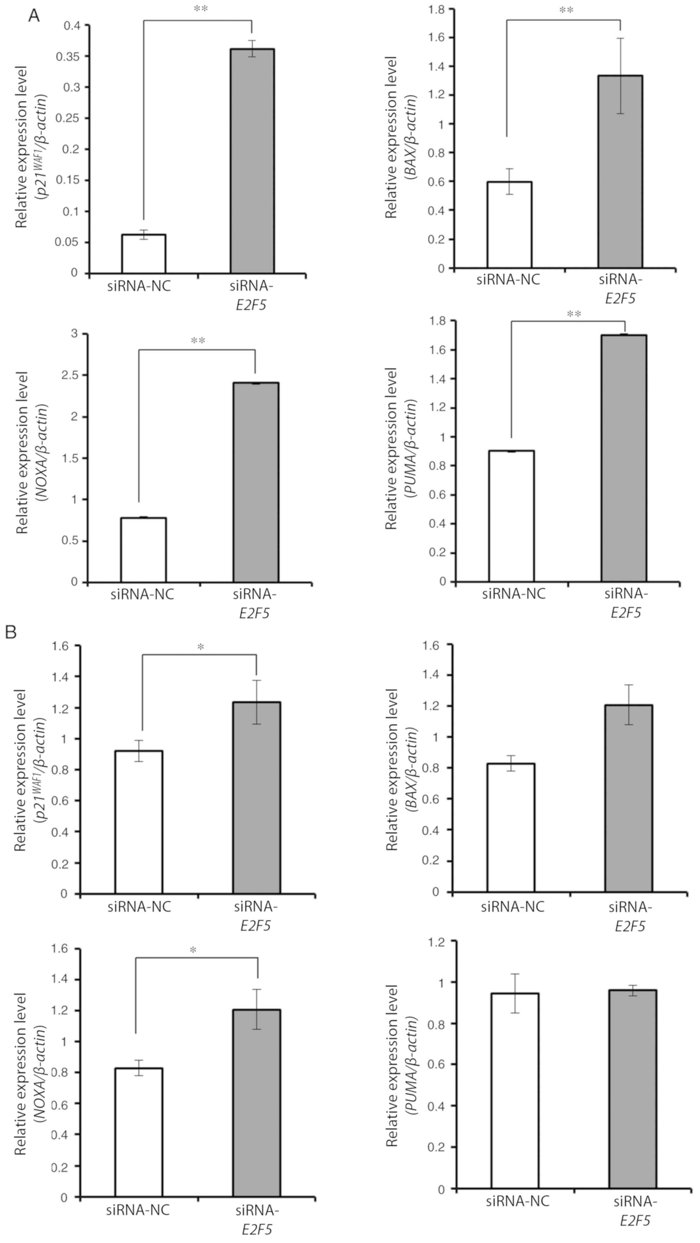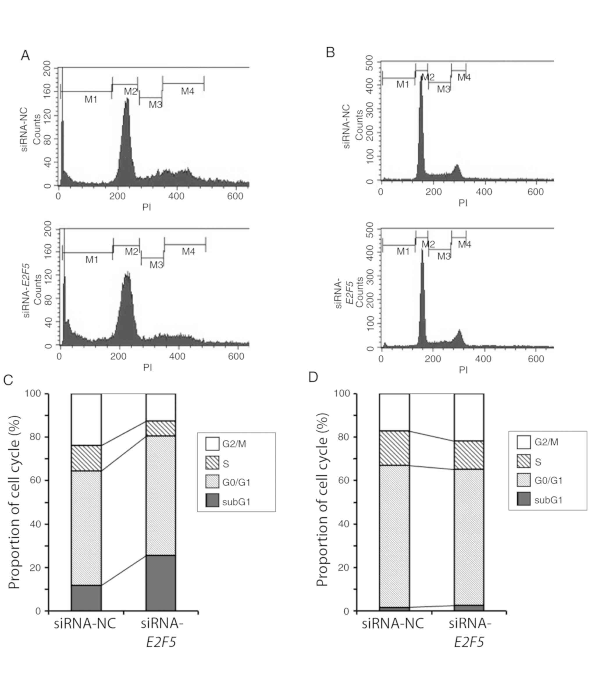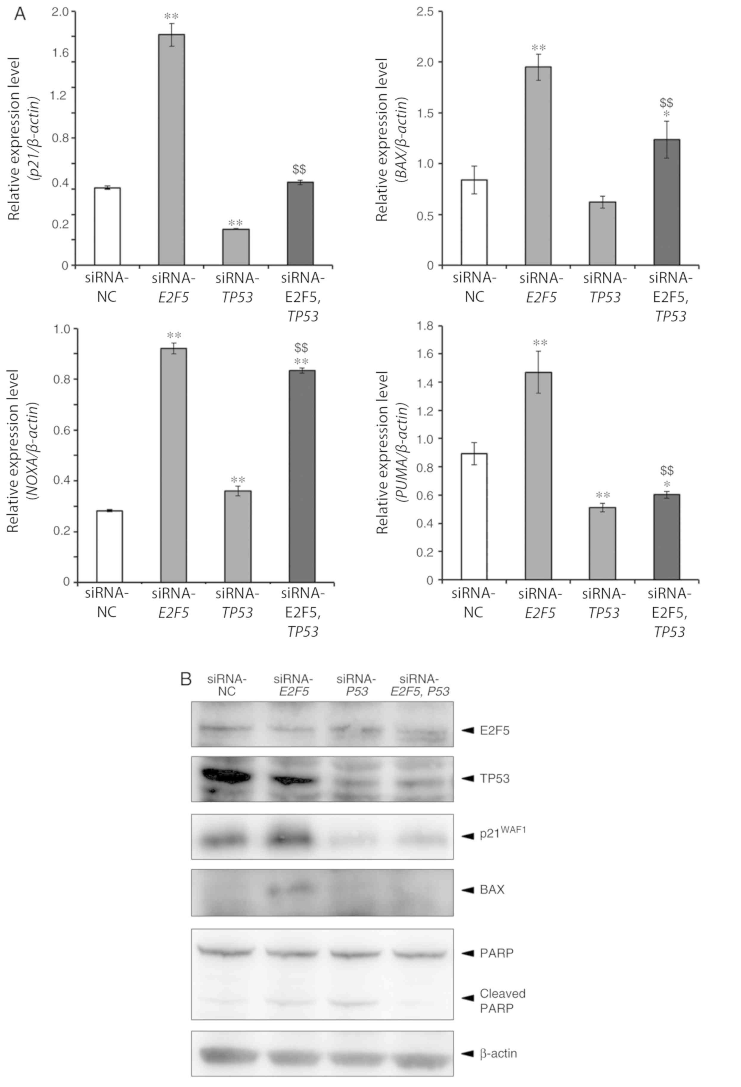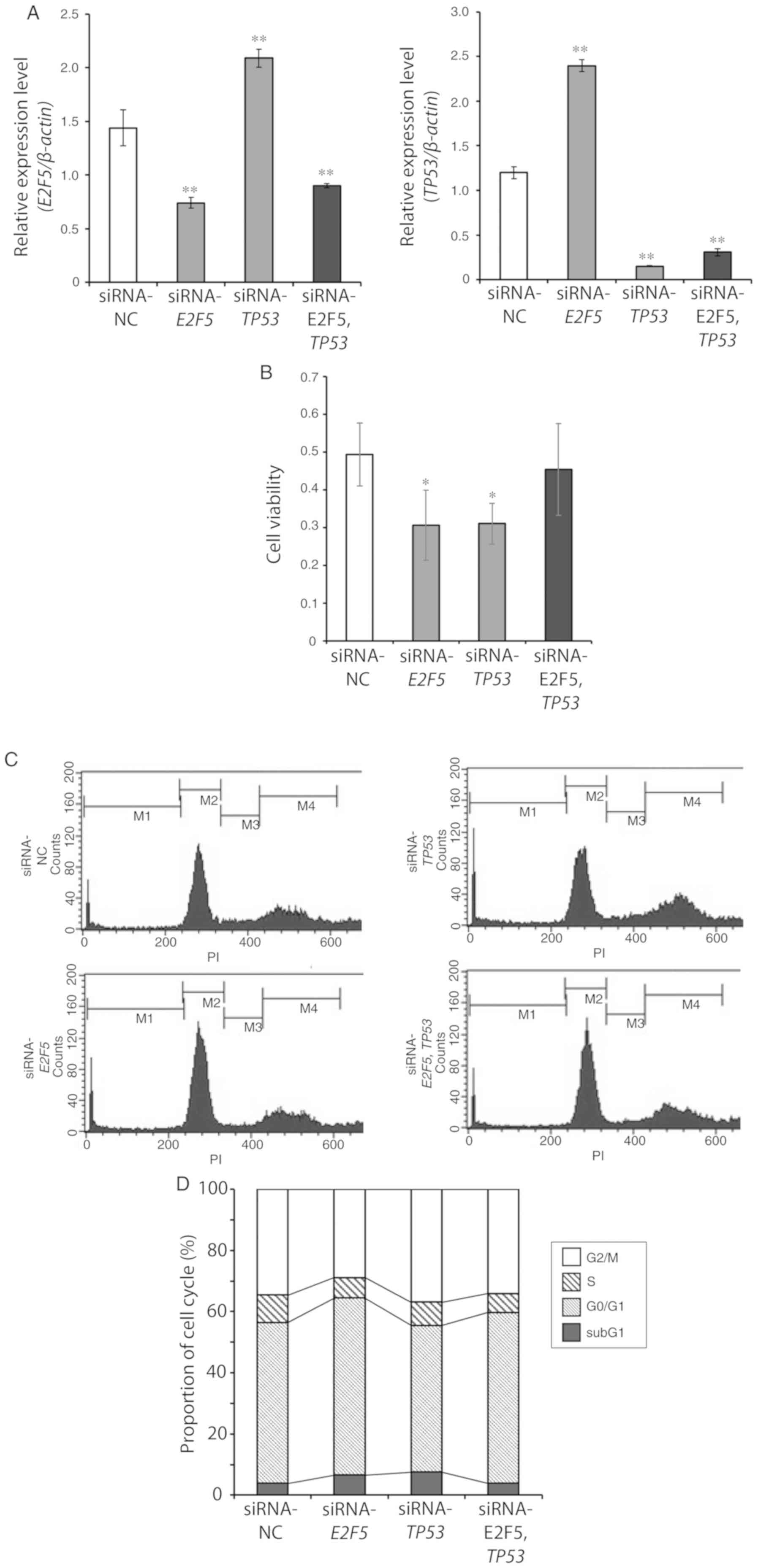 Cells were seeded at a density of 5×104 cells/ml and allowed to attach on the bottom of culture plate. Twenty-four hours after seeding, cells were transfected with siRNA using Lipofectamine 3000 (Thermo Fisher Scientific, Inc.) in accordance with the manufacturer's instructions. siRNA for E2F5 (siRNA ID s4417; cat. no. 4392420; Thermo Fisher Scientific, Inc.), siRNA for TP53 (cat. no. sc-29435; Santa Cruz Biotechnology, Inc.), and control siRNA (cat. no. 4390843; Thermo Fisher Scientific, Inc.) were used in the present study.