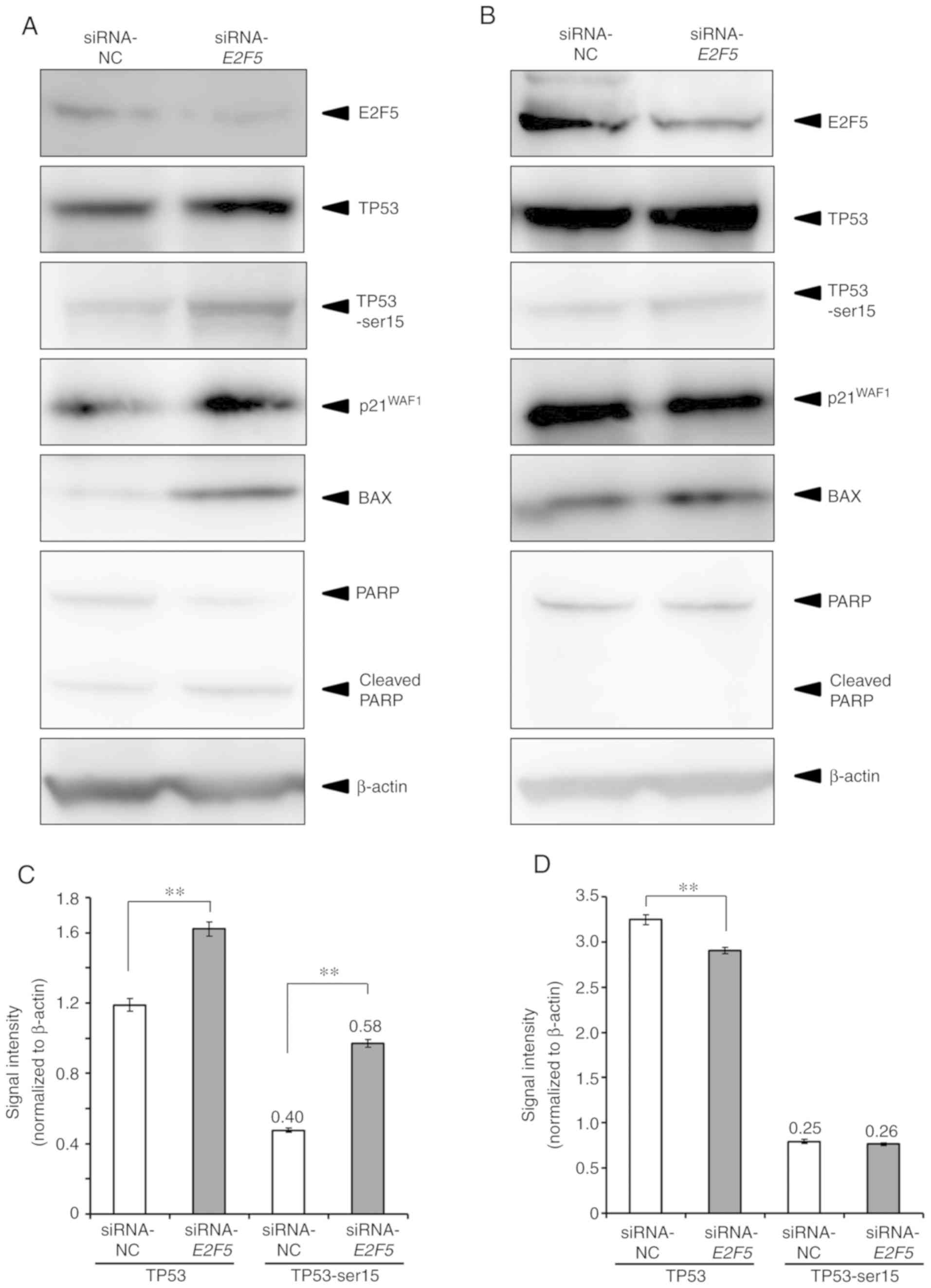 Cells were lysed in RIPA buffer containing protease inhibitor cocktail (Nacalai Tesque, Inc.) and phosphatase inhibitor cocktail (Nacalai Tesque, Inc.), followed by a brief sonication (BIORUPTOR UDC250; Cosmo Bio). Protein concentration of the lysates was measured using Bio-Rad DC kits (Bio-Rad Laboratories, Inc.). The lysates containing 15 µg protein/lane were separated by 4–12% SDS-polyacrylamide gel electrophoresis (SDS-PAGE) and then electroblotted onto Immobilon-P membranes (EMD Millipore). Membranes were blocked with Blocking-one (Nacalai Tesque, Inc.) overnight at 4°C, and incubated with anti-E2F5 (dilution 1:500; cat. no. GTX129491; GeneTex, Inc.), anti-TP53 (DO1; dilution 1:1,000; cat. no. sc-126; Santa Cruz Biotechnology, Inc.), anti-phospho-TP53 at Ser-15 (dilution 1:1,000; product no. 9284; Cell Signaling Technology, Inc.), anti-p21WAF1 (dilution 1:500; cat. no. sc-756; Santa Cruz Biotechnology, Inc.), anti-BAX (dilution 1:1,000; cat. no. 2772; Cell Signaling Technology, Inc.), anti-PARP (dilution 1:1,000; product no. 9542; Cell Signaling Technology, Inc.) or with anti-β-actin antibody (dilution 1:5,000; product no. A5441; Sigma-Aldrich; Merck KGaA) at 4°C. After 24 h of incubation, the membranes were washed with Tris-buffered saline containing 0.1% Tween-20 (TBS-T), followed by incubation with horseradish peroxidase-conjugated secondary antibodies for mouse (dilution 1:2,000; cat. no. NA931V) or for rabbit (dilution 1:2,000; cat. no. NA934V; both GE Healthcare Life Sciences) for 1 h at room temperature. The membranes were washed extensively with TBS-T, and treated with Chemi-Lumi-One Super (Nacalai Tesque, Inc.) to visualize immunoreactivity using LAS4000 (Fujifilm). Intensity of the bands for TP53 and phosphorylated TP53 were measured by ImageJ software ver. 1.48 (National Institutes of Health).