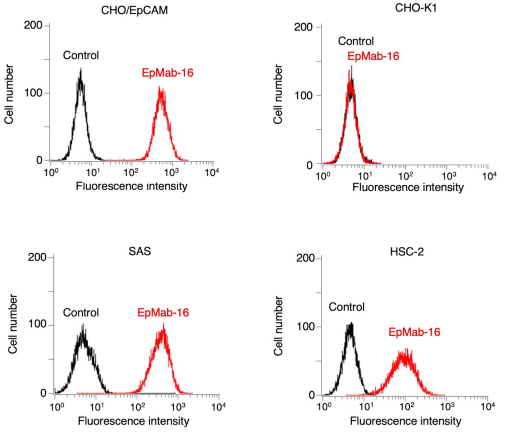 Anti-EpCAM mAbs were developed by immunizing a single mouse with CHO/EpCAM cells. Hybridomas were cultured, and supernatants positive for CHO/EpCAM and negative for CHO-K1 were selected by flow cytometry. Further screening using western blot and immunohistochemical assays were performed for validation, resulting in EpMab-16 (IgG2a, kappa) identification and establishment.