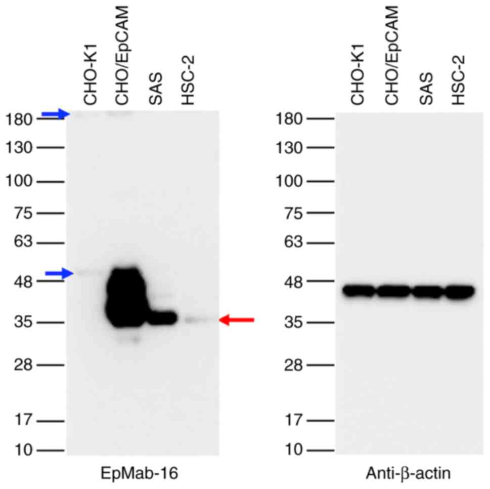 Cell pellets were resuspended in PBS with 1% Triton X-100 (cat. no. 168-11805; FUJIFILM Wako Pure Chemical Corporation) and 50 µg/ml aprotinin (product no. 03346-84; Nacalai Tesque, Inc.). Protein concentration was determined by BCA method. Cell lysates were boiled in sodium dodecyl sulfate sample buffer (Nacalai Tesque, Inc.). The samples (10 µg/lane) were then electrophoresed on 5-20% polyacrylamide gels (Nacalai Tesque, Inc.) and transferred onto polyvinylidene difluoride (PVDF) membranes (Merck KGaA). After blocking with 4% skim milk (Nacalai Tesque, Inc.) for 1 h, the membrane was incubated with an anti-EpCAM mAb (5 µg/ml) or anti-β-actin (1 µg/ml; clone AC-15; cat. no. A5441; Sigma-Aldrich; Merck KGaA) for 1 h, followed by incubation with HRP-conjugated anti-mouse immunoglobulins (cat. no. P0260; Agilent Technologies, Inc.) or anti-rat IgG (cat. no. A9542; Sigma-Aldrich; Merck KGaA) at a 1:2,000 dilution for 1 h. The membrane was developed using the ImmunoStar LD Chemiluminescence Reagent (FUJIFILM Wako Pure Chemical Corporation) and a Sayaca-Imager (DRC Co., Ltd.). All western blot procedures were performed at room temperature.