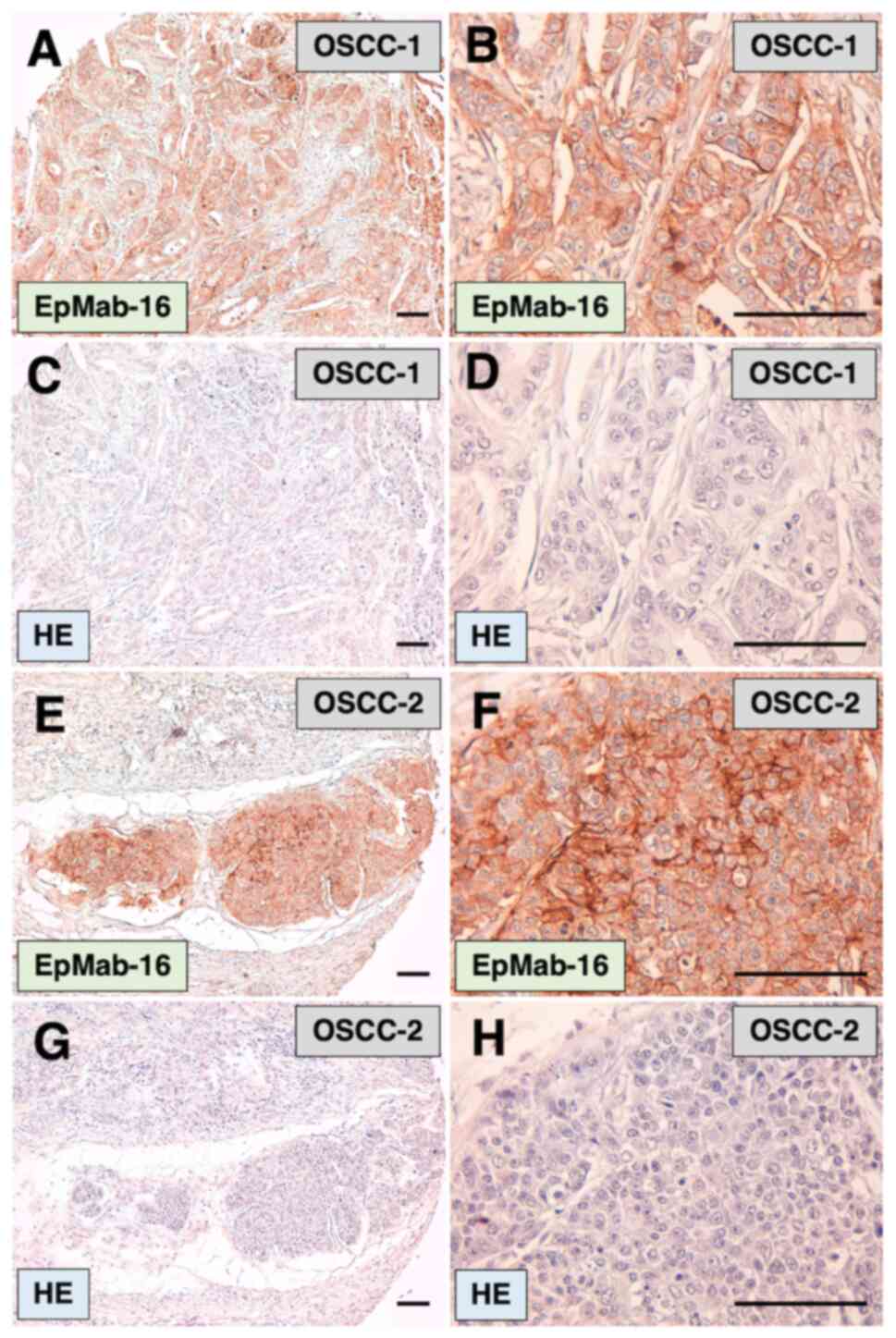 Histologic sections 4-µm thick of an oral cancer tissue array (cat. no. OR481; US Biomax, Inc.) were autoclaved directly in EnVision FLEX Target Retrieval Solution, High pH (Agilent Technologies, Inc.) for 20 min. Sections were then incubated with 10 µg/ml of an anti-EpCAM mAb for 1 h at room temperature and treated using an Envision+ kit (Agilent Technologies, Inc.) for 30 min according to the manufacturer's instructions. The color was developed using 3, 3′-diaminobenzidine tetrahydrochloride (DAB; Agilent Technologies Inc.) for 2 min at room temperature, and sections were then counterstained with hematoxylin (FUJIFILM Wako Pure Chemical Corporation) at room temperature for 5 min. Hematoxylin and eosin (H&E) staining (FUJIFILM Wako Pure Chemical Corporation) was performed using consecutive tissue sections at room temperature for 5 min. Leica DMD108 (Leica Microsystems GmbH) was used to examine the sections and obtain images (×100 and ×400).