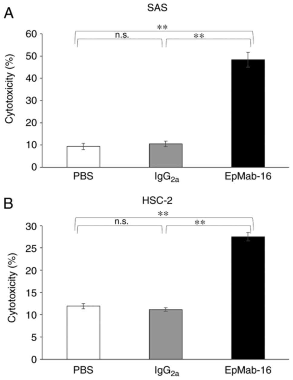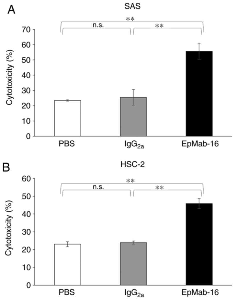 EpMab-16 was also associated with more robust CDC activity (56% cytotoxicity) in SAS cells than control mouse IgG2a (26% cytotoxicity; P<0.01) or control PBS treatment (23% cytotoxicity; P<0.01) (Fig. 6A). Similarly, EpMab-16-treated cells exhibited more CDC activity (46% cytotoxicity) in HSC-2 cells than control mouse IgG2a (24% cytotoxicity; P<0.01) or control PBS treatment (23% cytotoxicity; P<0.01) (Fig. 6B). These favorable ADCC and CDC activity results indicated that EpMab-16 may induce strong antitumor action against oral cancer cells in vivo as well as in vitro.