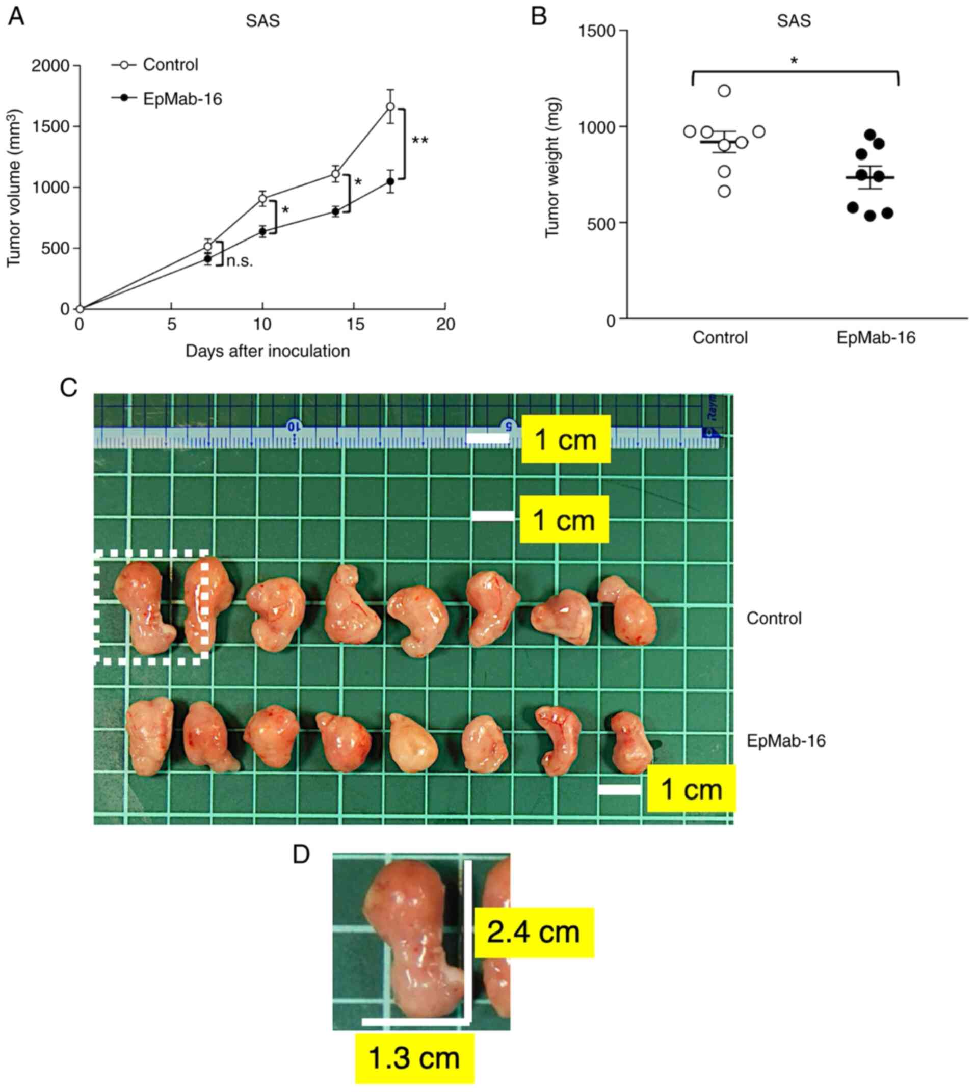 On days 1, 8, and 14 after SAS cell injections into the mice, EpMab-16 (100 µg) or control mouse IgG (100 µg) were injected i.p. in SAS xenograft model mice. Tumor formation was observed in mice from treatment and control groups. Tumor volume was measured on days 7, 10, 14, and 17 after SAS cell injection. EpMab-16-treated mice exhibited significantly less tumor growth on day 10 (P<0.05), day 14 (P<0.05) and day 17 (P<0.01) compared with IgG-treated control mice (Fig. 7A). Tumor volume reduction by EpMab-16 treatment was 37% as of day 17. Tumors from EpMab-16-treated mice weighed significantly less than tumors from IgG-treated control mice (20% reduction, P<0.05; Fig. 7B). Resected tumors on day 17 are presented in Fig. 7C. Total body weights did not significantly differ between the treatment and control groups (Fig. S1). These results indicated that EpMab-16 reduced the growth of SAS xenografts, but did not altogether eliminate them.