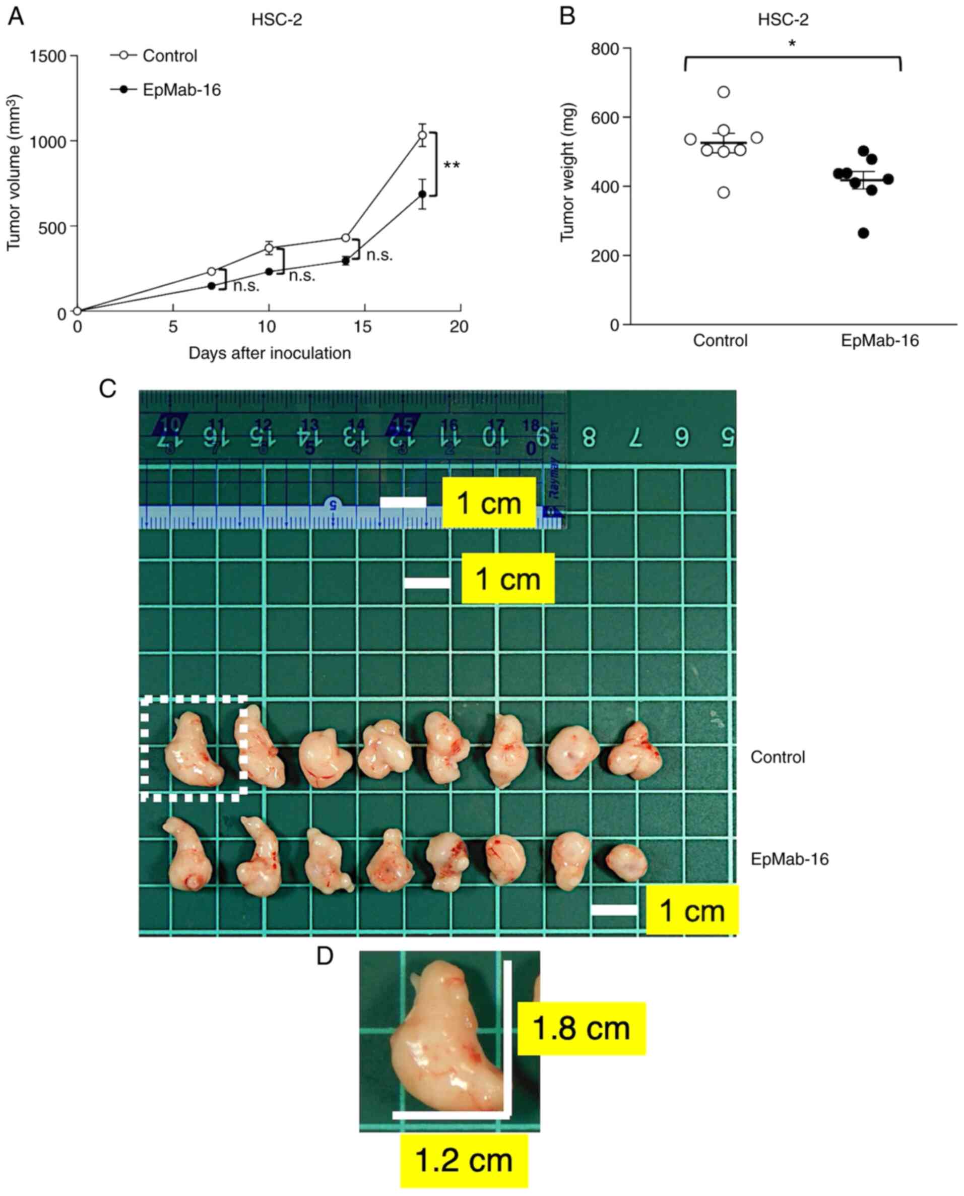 On days 1, 8, and 14 after HSC-2 cell injections, EpMab-16 (100 µg) or control mouse IgG (100 µg) were injected i.p. into HSC-2 ×enograft model mice. Tumor formation was observed in mice in the treatment and control groups. Tumor volume was measured on days 7, 10, 14, and 18 after HSC-2 cell injection. The EpMab-16-treated mice exhibited significantly less tumor growth on day 18 (P<0.01) than the IgG-treated control mice (Fig. 8A). Tumor volume reduction by EpMab-16 treatment was 33% as of day 18. Tumors from EpMab-16-treated mice weighed significantly less than tumors from IgG-treated control mice (21% reduction, P<0.05; Fig. 8B). Resected tumors on day 18 are presented in Fig. 8C. Total body weights did not significantly differ between the treatment and control groups (Fig. S1). These results indicated that EpMab-16 reduced the growth of HSC-2 ×enografts, although it did not eliminate them.