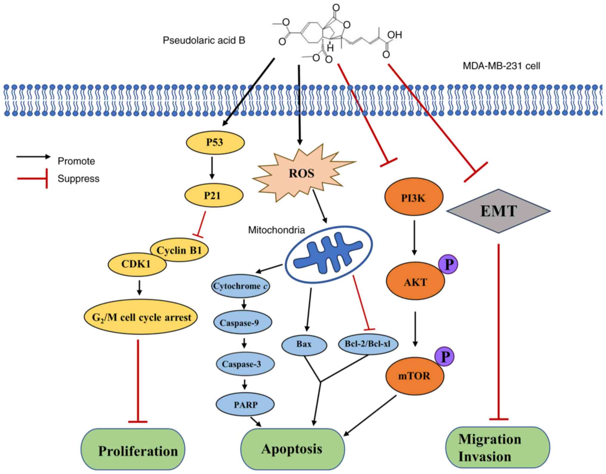 In conclusion, the present results demonstrated that PAB exhibited anticancer effects against TNBC and that the mechanism was related to multiple pathways (Fig. 7). The present study revealed that PAB significantly inhibited the proliferative ability of MDA-MB-231 cells by arresting the cell at the G2/M phase. The pro-apoptotic activity of PAB in TNBC was demonstrated through activation of the mitochondrial apoptosis pathway and inhibition of the PI3K/AKT/mTOR signaling pathway. PAB also demonstrated an anticancer effect on TNBC by inhibiting cell migration and invasion, through a mechanism related to the suppression of EMT. Overall, these results provided evidence that PAB exerted multiple anticancer activities through multiple targets in TNBC.