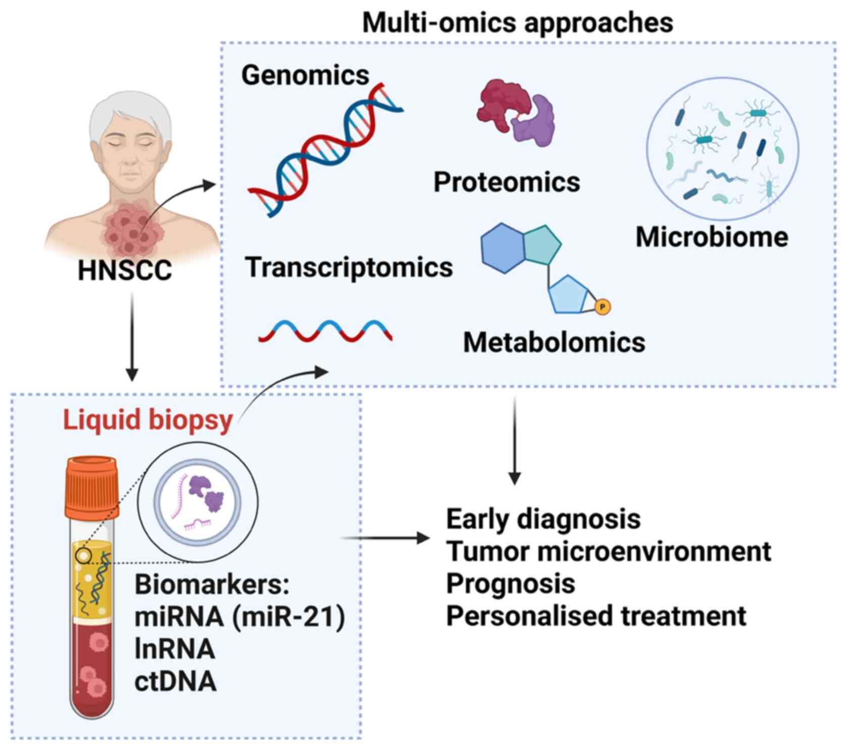 Mishra V, Singh A, Chen X, Rosenberg AJ, Pearson AT, Zhavoronkov A, Savage PA, Lingen MW, Agrawal N and Izumchenko E: Application of liquid biopsy as multi-functional biomarkers in head and neck cancer. Br J Cancer. 126:361–370. 2022. View Article : Google Scholar : PubMed/NCBI