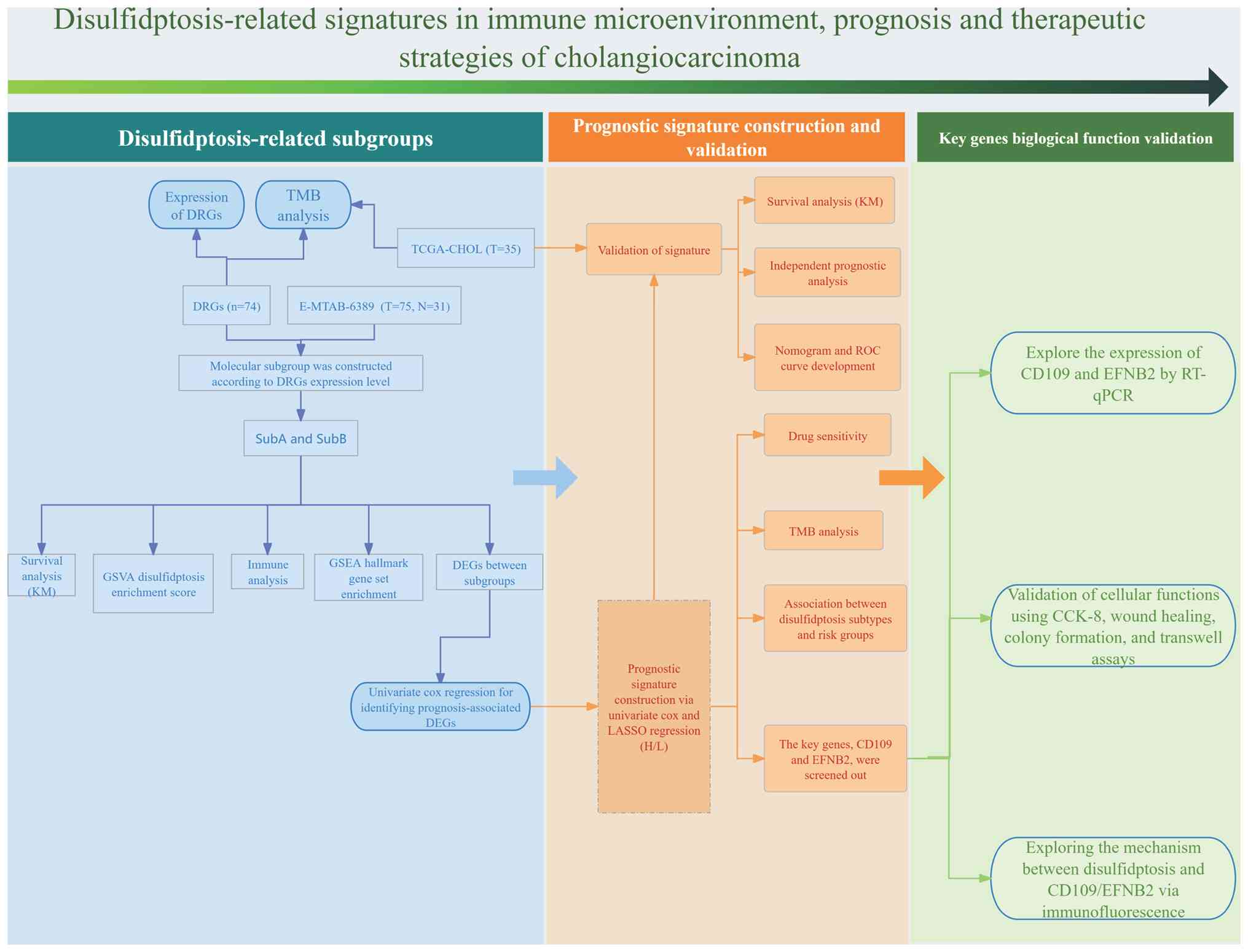 To investigate this unexplored area, DRGs in CCA were systematically evaluated using RNA sequencing data from The Cancer Genome Atlas (TCGA) and European Molecular Biology Laboratory-European Bioinformatics Institute (EMBL-EBI). Differential expression analysis was performed to identify candidate DRGs, then unsupervised clustering was used to define patient subgroups with distinct clinical and molecular characteristics. Building on these findings, a prognostic signature was developed using least absolute shrinkage and selection operator (LASSO) regression and validated through functional assays to elucidate the ways key DRGs regulate disulfidptosis. To the best of our knowledge, the present study revealed the first comprehensive landscape of disulfidptosis in CCA, associating DRG activity to patient survival, immune microenvironment remodeling and therapeutic responsiveness. These findings not only offer a prognostic tool, but also highlight actionable targets, opening new avenues for treating this intractable malignancy. The workflow of the present study is shown in Fig. 1.