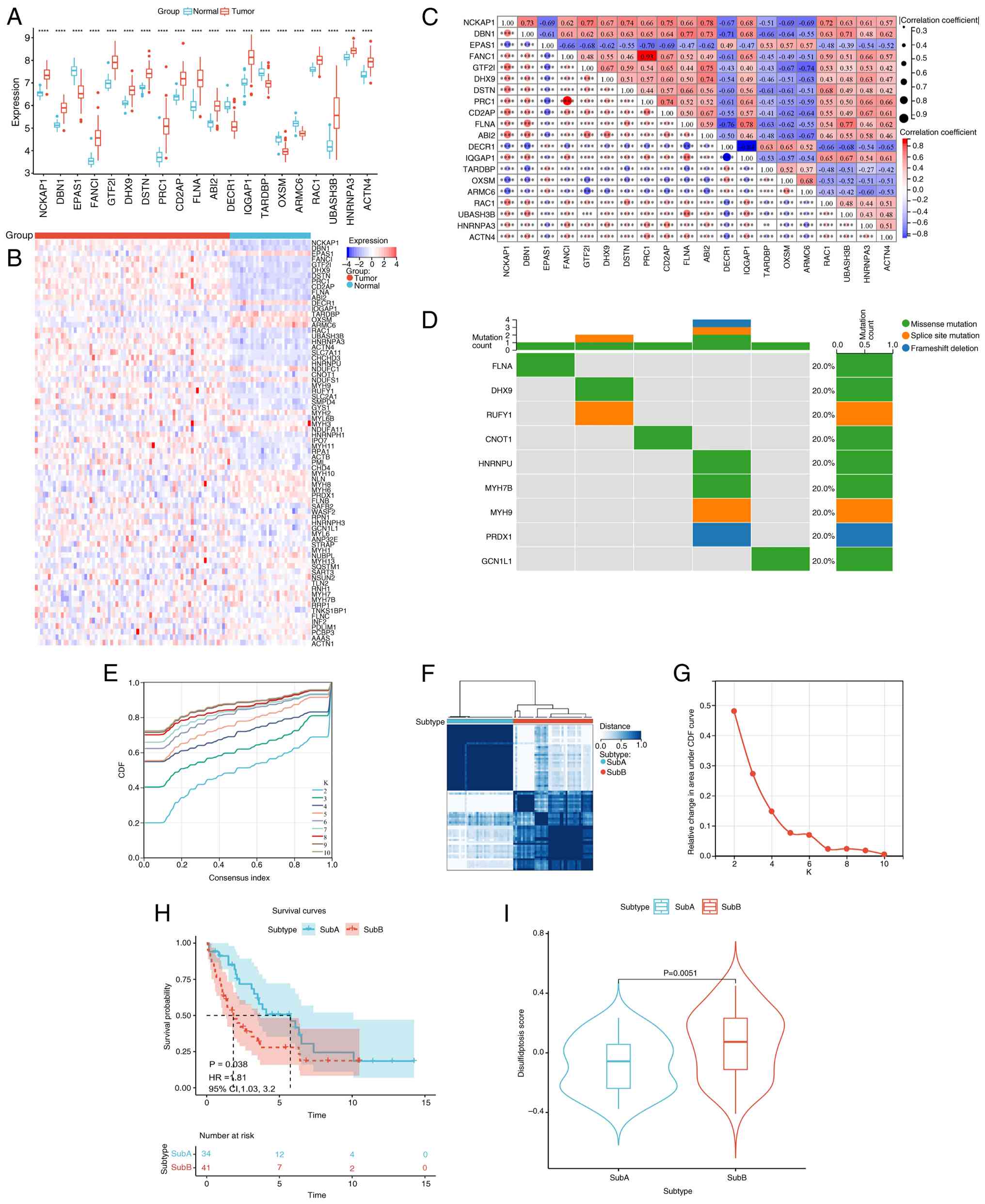 An integrated analysis of 100 DRGs in CCA was conducted. Expression profiles were extracted from the E-MTAB-6389 dataset, and differential expression was assessed using Wilcoxon rank-sum tests (FDR <0.05). Significant DRGs were visualized using boxplots. Pairwise co-expression relationships were evaluated using Pearson's correlation analysis. All statistical and bioinformatic analyses were performed using R version 4.4.1 (30). Somatic mutation landscapes were analyzed using TCGA data and the ‘maftools’ package (31) (https://bioconductor.uib.no/packages/release/bioc/html/maftools.html) version 2.18.0, with alterations depicted in waterfall plots. To identify disulfidptosis-driven molecular Subs, unsupervised consensus clustering was performed on tumor samples using the ‘ConsensusClusterPlus’ package (32) (https://bioconductor.org/packages/release/bioc/html/ConsensusClusterPlus.html) version 1.54.0.