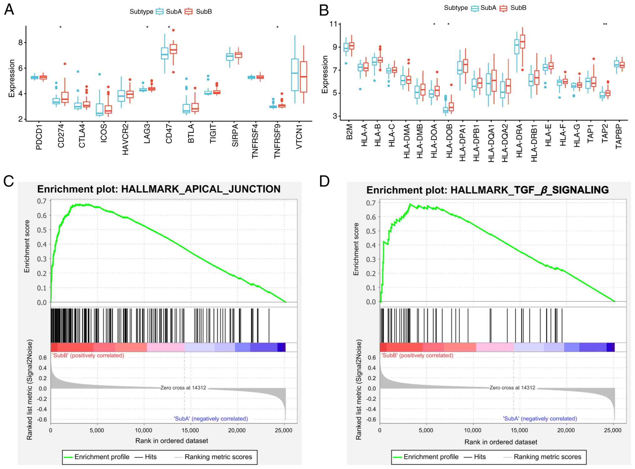 To investigate the relationship between disulfidptosis Subs and the immune microenvironment in CCA, the CIBERSORT algorithm was applied to evaluate infiltration of 22 immune cell types. Comparative analysis (P<0.05) revealed significantly lower monocyte levels in SubB compared with SubA, with an increased number of activated dendritic and resting mast cells in SubB (Fig. 3A). ESTIMATE analysis indicated higher stromal and ESTIMATE scores in SubB (P<0.05), while SubA exhibited greater tumor purity (Fig. 3B-E). Immune scores trended higher in SubB. ssGSEA analysis revealed significantly enhanced effector immune cell activity in SubB, including CD8+ T cells, CD4+ T cells and natural killer cells (P<0.05), indicating robust antitumor immunity (Fig. 3F). By contrast, SubA exhibited elevated levels of γδ T cells and dendritic cells, associated with adaptive immunity and antigen presentation. Immune checkpoint genes (PD-L1, LAG3, CD47 and TNFRSF9) and HLA antigen presentation genes (HLA-DOA, HLA-DOB and TAP2) were significantly upregulated in SubB (P<0.05; Fig. 4A and B). GSEA analysis of the E-MTAB-6389 dataset revealed SubB enrichment in APICAL_JUNCTION and TGF_β_SIGNALING pathways (Fig. 4C and D; FDR <0.05), suggesting roles in immune evasion and structural remodeling.