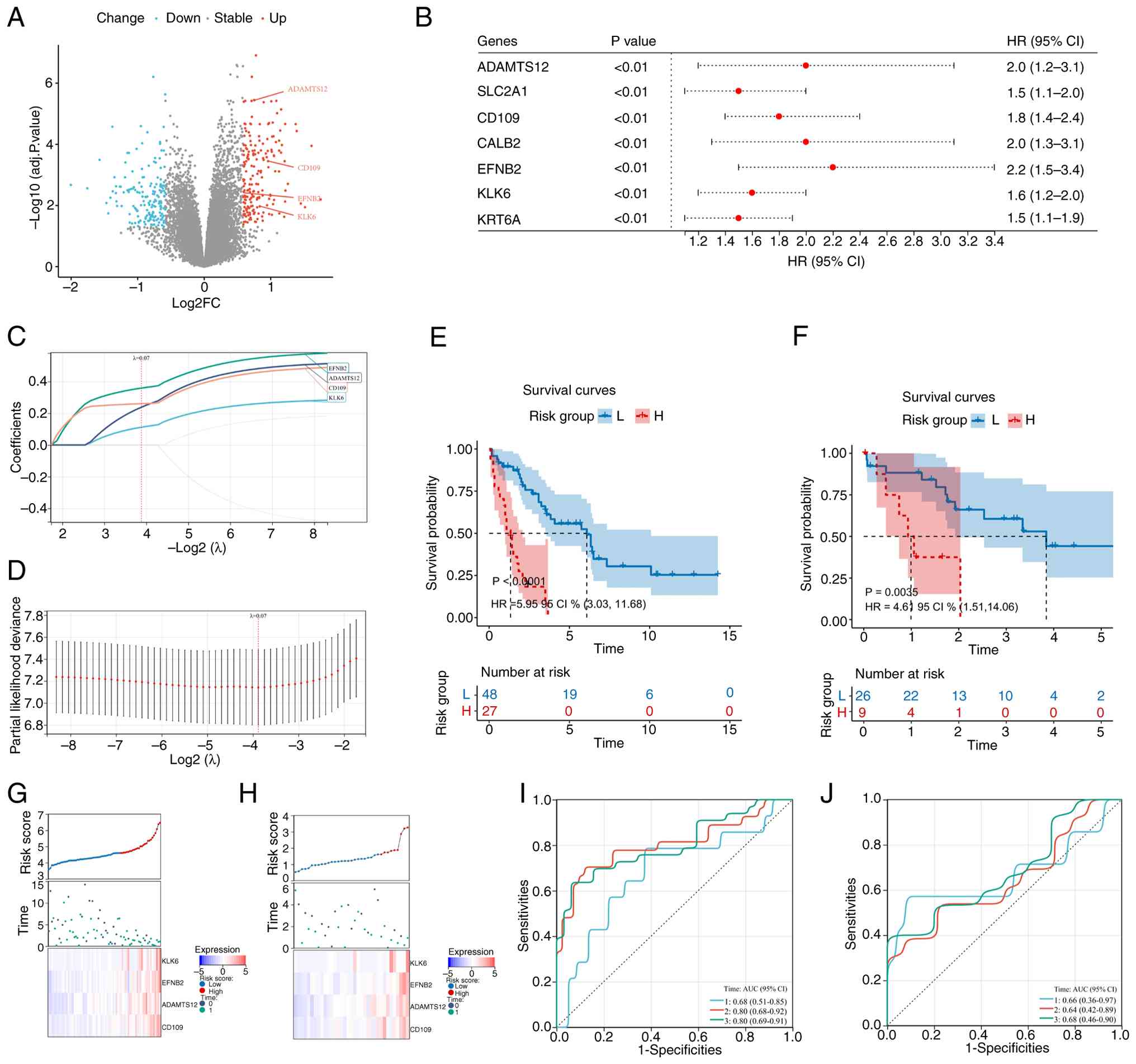 Differentially expressed gene (DEG) analysis between the DRG subgroups identified 190 upregulated genes and 173 downregulated genes (Fig. 5A; Table SV). Univariate Cox regression analysis of the 363 DEGs revealed seven prognosis-related genes (ADAMTS12, SLC2A1, CD109, CALB2, EFNB2, KLK6 and KRT6A) with P<0.01 and HRs ranging from 1.5 (95% CI, 1.1–1.9) to 2.2 (95% CI, 1.5–3.4; Fig. 5B). LASSO regression selected a four-gene prognostic signature (EFNB2, CD109, KLK6 and ADAMTS12) with positive coefficients (Fig. 5C and D; Table SVI). The risk score was calculated as follows: RiskScore=0.3589 × Exp (EFNB2) + 0.2604 × Exp (CD109) +0.2382 × Exp (ADAMTS12) + 0.1120 × Exp (KLK6).