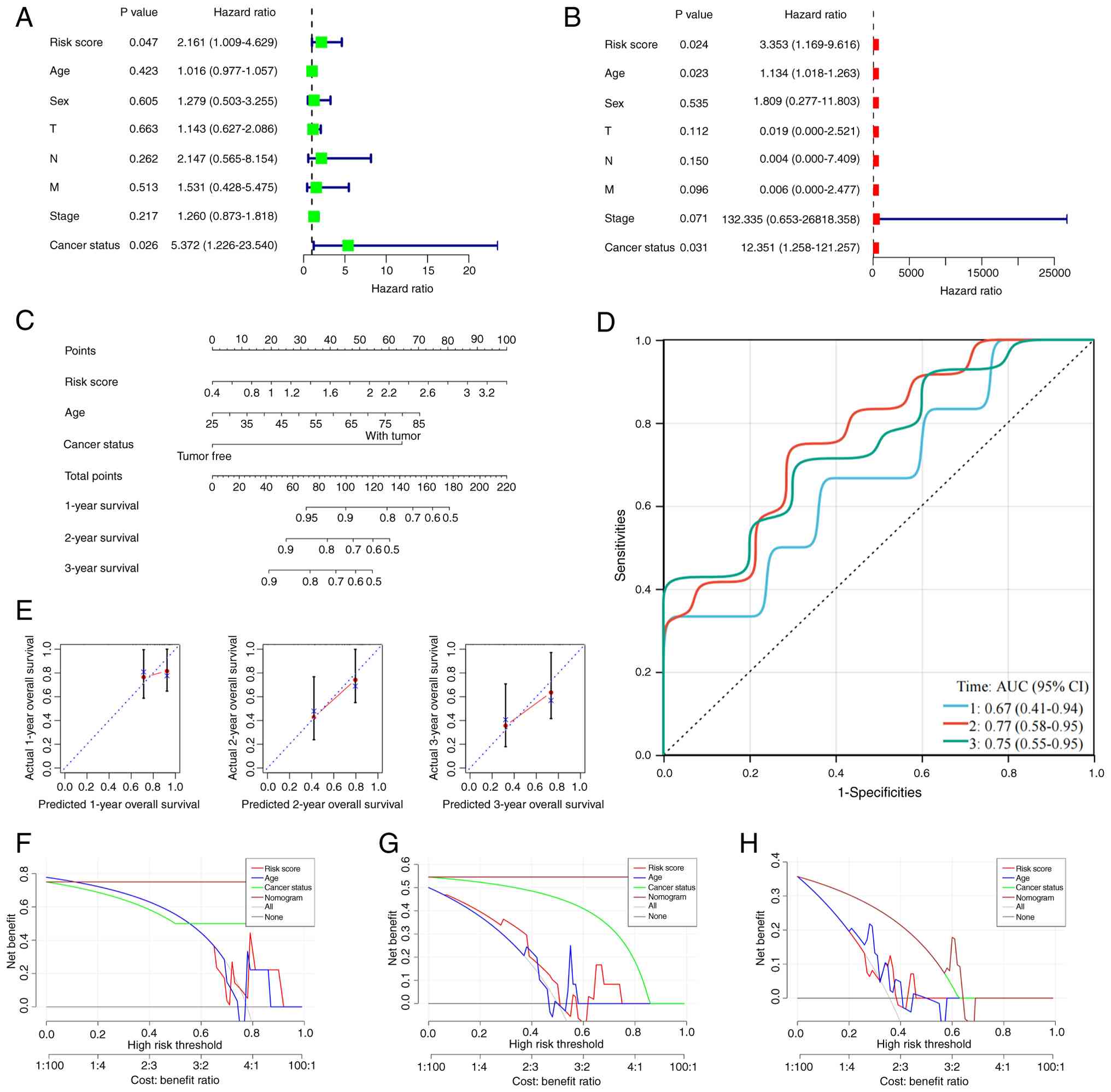 Using optimal cut-offs (EMBL-EBI; 4.595; TCGA, 1.608), patients with CCA were classified into H- and L-risk groups. Kaplan-Meier analysis revealed significant survival differences in both the EMBL-EBI (P=0.0001; HR, 5.95; 95% CI, 3.03–11.68) and TCGA (P=0.0035; HR, 4.61; 95% CI, 1.51–14.06) datasets (Fig. 5E and F). Heatmaps showed increased expression of the signature genes in H-risk patients, consistent with positive coefficients (Fig. 5G and H). Time-dependent ROC analysis demonstrated area under the curves (AUCs) of 0.680, 0.800 and 0.800 (EMBL-EBI) and 0.660, 0.640 and 0.680 (TCGA; Fig. 5I and J) at 1, 2 and 3 years, respectively. Univariate and multivariate Cox regression confirmed that the risk score was an independent prognostic factor (P=0.024; HR, 3.353; 95% CI, 1.169–9.616) and multivariate analysis, including age (P=0.023; HR, 1.134; 95% CI, 1.018–1.263) and cancer status (P=0.031; HR, 12.351; 95% CI, 1.258–121.257), further validated its independence (Fig. 6A and B; Table SVII). A nomogram integrating the risk score, age and cancer status achieved AUCs of 0.670, 0.770 and 0.750 for 1-, 2- and 3-year predictions (Fig. 6C and D; Table SVIII). Calibration curves indicated strong agreement between predicted and observed outcomes (Fig. 6E). Decision curve analysis for the 1-, 2- and 3-year outcomes showed that the risk score model provided superior net benefit over age or cancer status alone, especially at medium-to-high thresholds, confirming its clinical utility in risk stratification and treatment decision-making for CCA (Fig. 6F-H).