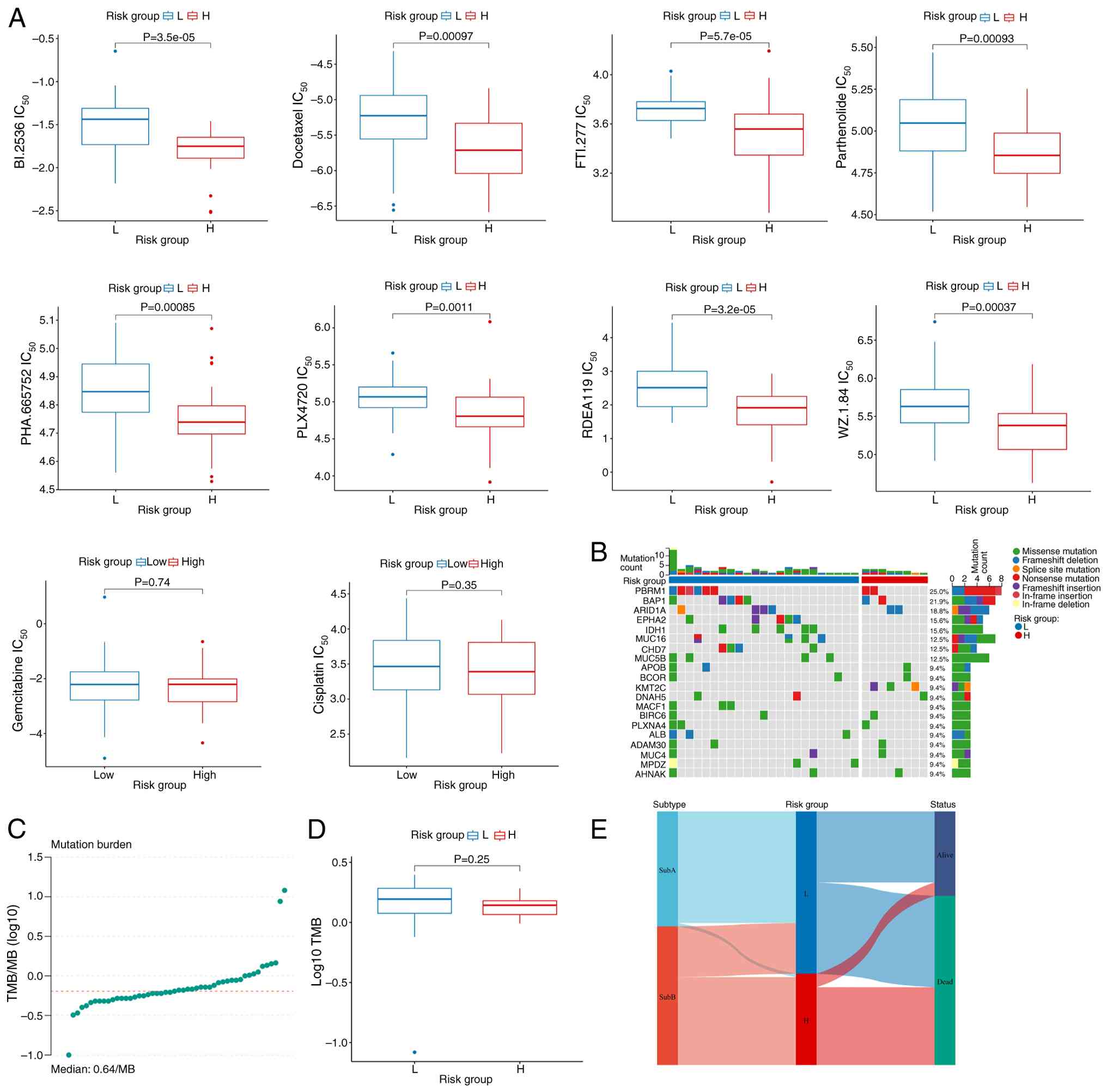 Chemotherapeutic drug sensitivity analysis demonstrated that eight antineoplastic agents, PLX-4720, WZ-1-84, refametinib, PHA-665752, parthenolide, FTI-277, docetaxel and BI2536, exhibited significantly lower IC50 values in the H-risk group compared with those in the L-risk group, suggesting heightened chemosensitivity in H-risk patients with CCA. However, no significant difference in efficacy was observed between risk groups for the standard first-line regimen, gemcitabine plus cisplatin (P<0.05; Fig. 7A; Table SIX). Mutation analysis identified PBRM1 as the most frequently altered gene among the top 20 mutated genes (Fig. 7B). TMB analysis using TCGA-CHOL data showed similar distributions across risk groups, with no significant differences in TMB values (Fig. 7C and D). Sankey diagram analysis revealed a predominant clustering of H-risk cases within the SubB disulfidptosis Sub (Fig. 7E), consistent with the association of the Sub with worse clinical outcomes.
