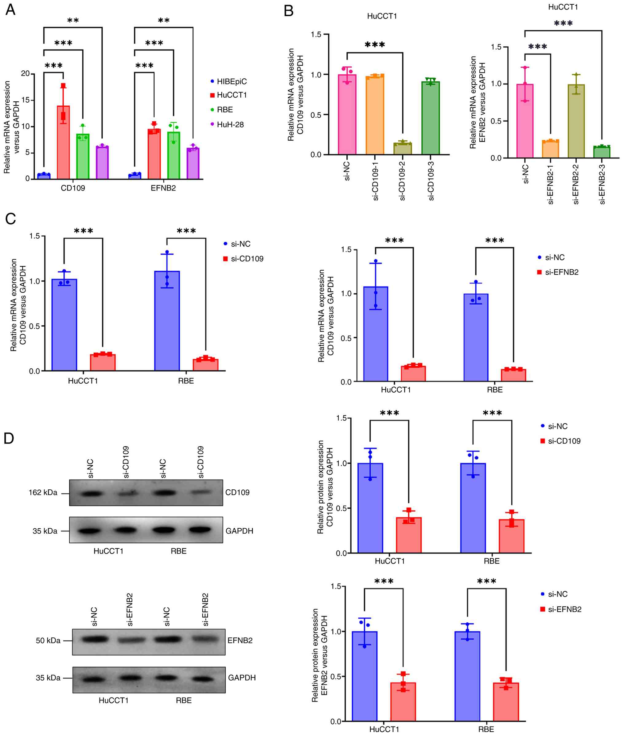 RT-qPCR was performed to assess mRNA expression of CD109 and EFNB2 in three CCA cell lines (HuCCT1, RBE and HuH-28) and in normal human intrahepatic biliary epithelial cells (HiBEpiCs). Compared with HiBEpiCs, CD109 and EFNB2 expression was significantly upregulated in HuCCT1 and RBE cells (P<0.001), and moderately upregulated in HuH-28 cells (P<0.01; Fig. 8A). Based on these results, HuCCT1 and RBE cells were selected for siRNA-mediated knockdown of CD109 and EFNB2. Three siRNAs were designed for each gene, and their mRNA suppression efficiency was evaluated by RT-qPCR. In HuCCT1 cells, si-CD109-2 and si-EFNB2-3 showed the most significant downregulation (P<0.001; Fig. 8B), and were selected for subsequent experiments. After transfecting si-CD109 and si-EFNB2 into HuCCT1 and RBE cells, RT-qPCR confirmed significant reductions in CD109 and EFNB2 mRNA levels (P<0.001; Fig. 8C), indicating efficient transfection. WB further revealed significantly reduced CD109 and EFNB2 protein levels in both cell lines (P<0.001; Fig. 8D), consistent with mRNA changes.