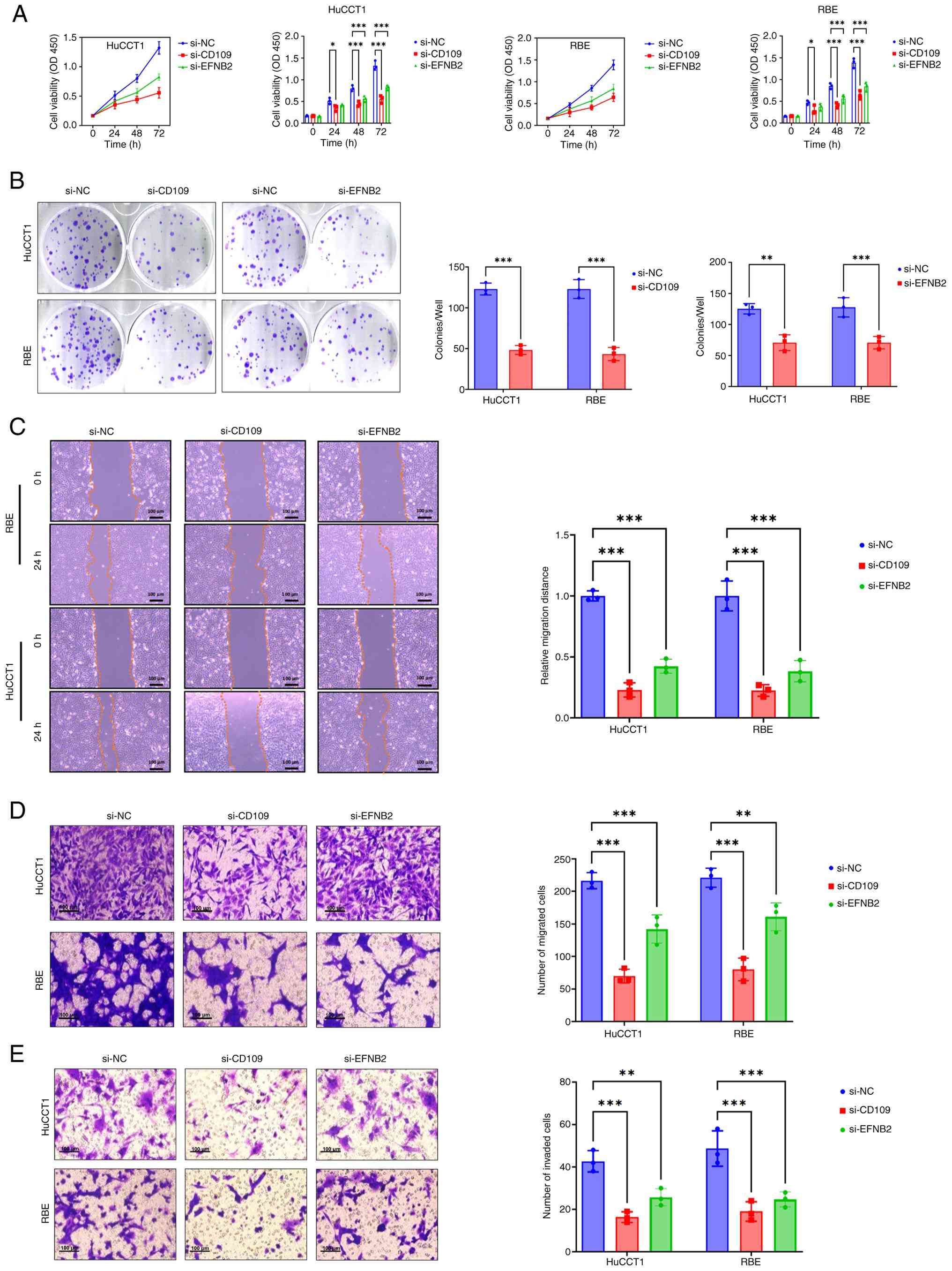 To evaluate the effects of CD109 and EFNB2 knockdown on CCA cell behavior, cell proliferation was assessed using the CCK-8 assay at 0, 24, 48 and 72 h in HuCCT1 and RBE cells transfected with si-CD109, si-EFNB2 or si-NC (control). Compared with the si-NC group, knockdown of CD109 or EFNB2 significantly reduced cell proliferation, with pronounced effects at 48 and 72 h (P<0.001); notably, si-CD109 exhibited stronger inhibition compared with si-EFNB2 (Fig. 9A). Clonogenic assays were performed to assess colony formation. HuCCT1 and RBE cells transfected with si-CD109 or si-EFNB2 formed significantly fewer colonies compared with the si-NC group (P<0.001; Fig. 9B). Wound healing assays evaluated cell migration. Compared with the si-NC group, the si-CD109 and si-EFNB2 groups exhibited significantly reduced wound closure in HuCCT1 and RBE cells, with si-CD109 showing greater inhibition (P<0.001; Fig. 9C). Transwell assays assessed migration and invasion. Migration assays showed significantly fewer migrating cells in si-CD109 and si-EFNB2 groups compared with si-NC (P<0.001; Fig. 9D). Invasion assays revealed similarly reduced invasive cell numbers in both knockdown groups (P<0.001; Fig. 9E). These findings indicate that CD109 and EFNB2 knockdown significantly inhibits proliferation, colony formation, migration and invasion in HuCCT1 and RBE cells, suggesting their key roles in CCA progression.