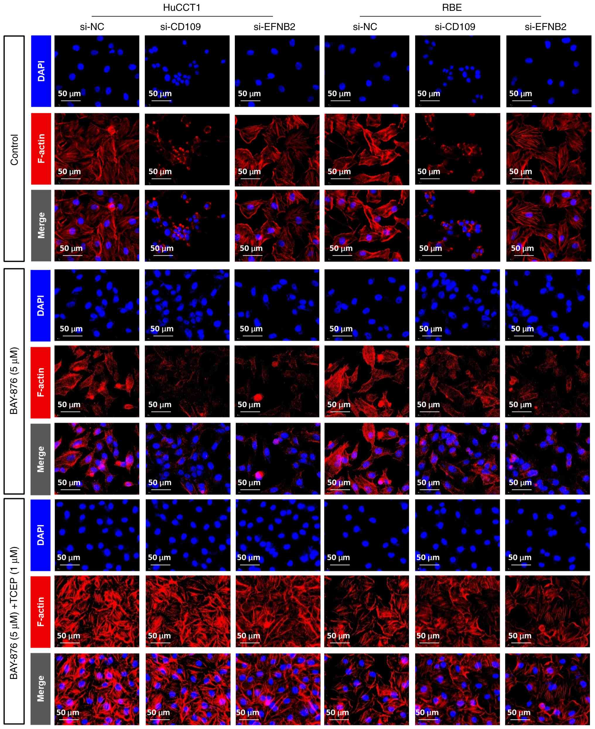 To investigate the role of EFNB2 and CD109 in disulfidptosis, immunofluorescence staining was carried out. The results (Fig. 10) showed that under glucose deprivation conditions, knocking down EFNB2 or CD109 in HuCCT1 and RBE cells induced cell shrinkage and abnormal F-actin aggregation. Treatment with the GLUT1 inhibitor BAY-876 exacerbated these morphological changes, with more pronounced actin depolymerization observed in the si-CD109 group, suggesting that CD109 may regulate cytoskeletal dynamics during disulfide bond accumulation. Intervention with the reducing agent TCEP largely alleviated F-actin aggregation in the si-CD109 group, but only partially in the si-EFNB2 group, indicating that EFNB2 may carry out a more key role in maintaining cytoskeletal stability. These findings suggest that the knockout of EFNB2 and CD109 enhances BAY-876-induced disulfidptosis, with TCEP preventing these effects.