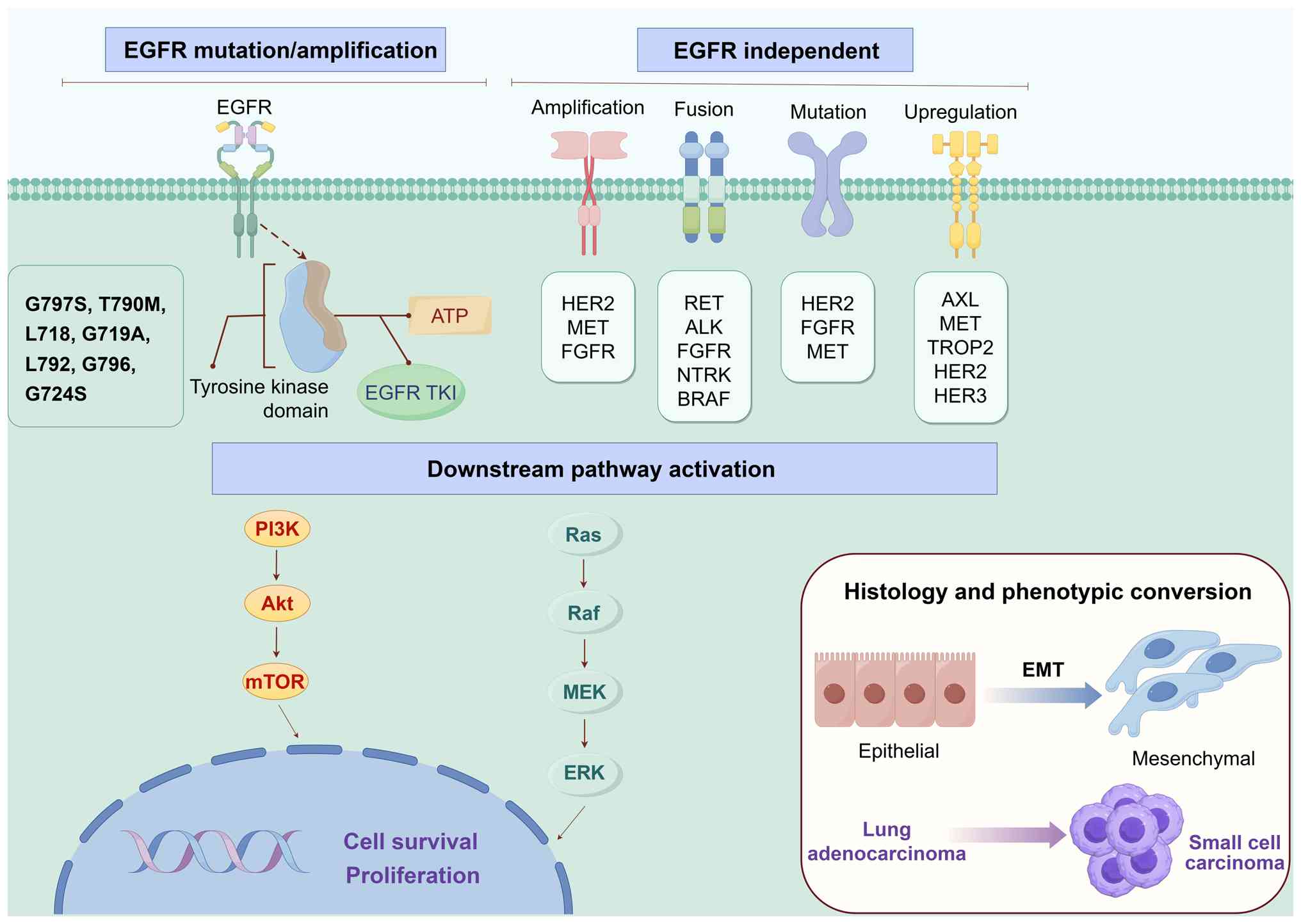 In Asian populations, over half of patients with NSCLC had EGFR-activating mutations (11). For individuals with locally progressed or metastatic NSCLC, EGFR-TKIs are now the standard therapy regimen (12,13). Their principal mechanism is competitive binding to the ATP-binding site inside the EGFR kinase domain, which inhibits kinase autophosphorylation and downstream signaling cascades. This effect inhibits tumor cell development, proliferation and metastasis (14). With improvements in medical research, numerous EGFR-TKIs from the first to third generations are now clinically available, markedly improving patient survival rates. However, despite initial success, nearly all patients develop acquired resistance to EGFR-TKI therapy, with a median progression-free survival (mPFS) of ~1 year (15,16). Resistance to EGFR-TKIs can be divided into two categories: Primary and acquired (16). Of patients with EGFR mutations, ~30% demonstrate primary resistance at the start of initial treatment, indicating no objective response to TKI therapy; however, the mechanisms causing this resistance remain unknown. However, acquired resistance refers to disease progression that occurs following an initial response to treatment. Its causes are complicated and diverse, consisting mostly of EGFR-dependent resistance, non-EGFR-dependent resistance (induced by activation of EGFR bypass or downstream signaling pathways) and histological or phenotypic alteration (17).