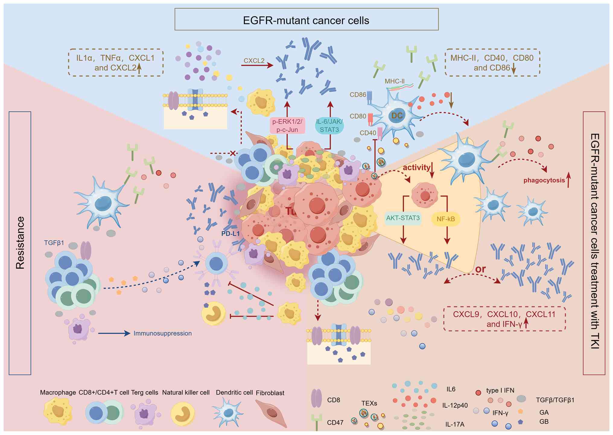 Cytokines and chemokines in the TME are also regulated by EGFR-TKIs. According to molecular research, cytokines can modulate immunological signaling by causing target-cell receptors to undergo structural or functional changes, such as receptor breakage or shedding (77–79). In patients with EGFR-mt NSCLC, the pro-inflammatory cytokine IL-17A was highly expressed, along with markedly increased expression of transforming growth factor-β (TGF-β), which are closely associated with cell proliferation and induction of TKI resistance (80,81). Compared with AM in control mice, AM in hormone mice produced more cytokines (such as IL-1α and TNF-α) and chemokines [such as CXC motif chemokine ligand (CXCL) 1 and CXCL2] (48). In addition, the chemokine CXCL2 secreted by CAFs is considered to induce the expression of PD-L1 in LA cells, thereby indirectly modulating tumor immunity (82).