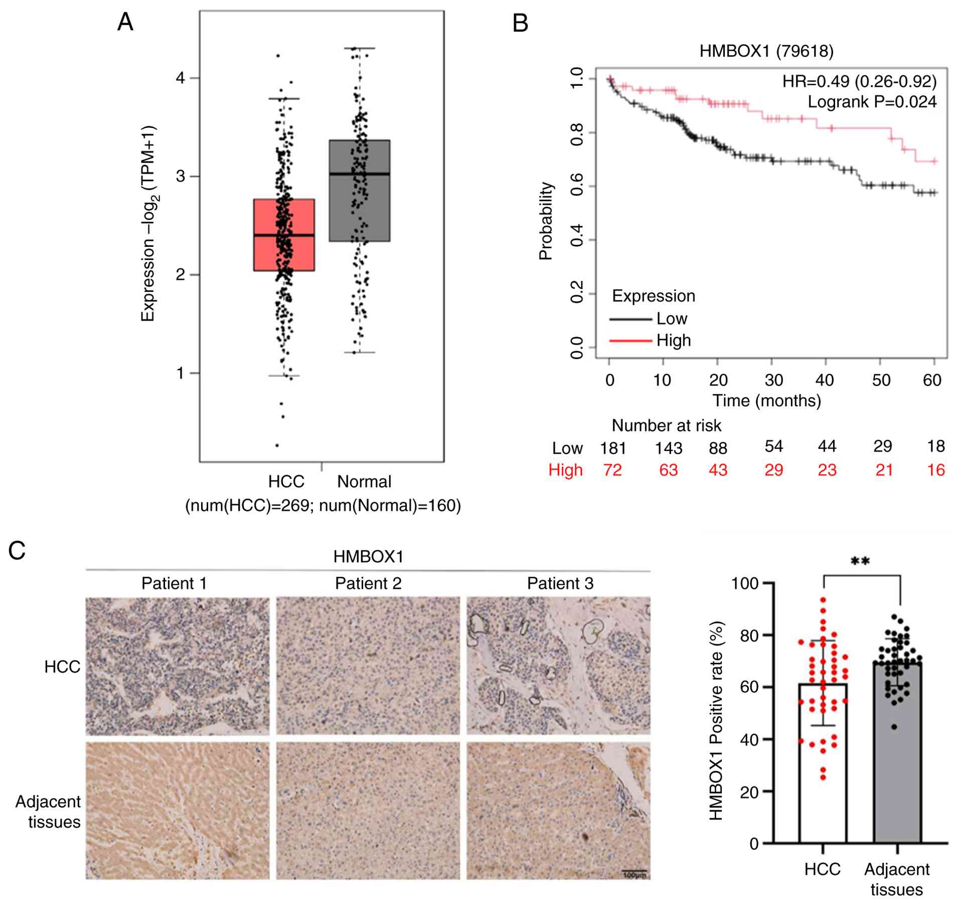The transcriptional repressor homeobox containing 1 (HMBOX1) was first isolated from a human pancreatic cDNA library and is widely expressed in various human organ tissues. As a novel transcriptional repressor, there is relatively little research on the biological activity of HMBOX1, mainly involving studies on cell differentiation and development, immune regulation, cellular autophagy and aging, and tumor pathology (6). As previously reported, HMBOX1 exerts distinct regulatory effects on different types of tumors. For instance, in osteosarcoma, cervical cancer and ovarian cancer, HMBOX1 impedes tumor cell immune evasion and malignant proliferation (7,8). Conversely, in gastric cancer, it can facilitate tumor growth and metastasis, underscoring the intricate regulatory mechanisms of HMBOX1 in tumorigenesis (9). Preliminary research found that the expression level of HMBOX1 in liver cancer tissue is significantly decreased (10), but the specific regulatory mechanism and its effect on tumor growth are still unclear.