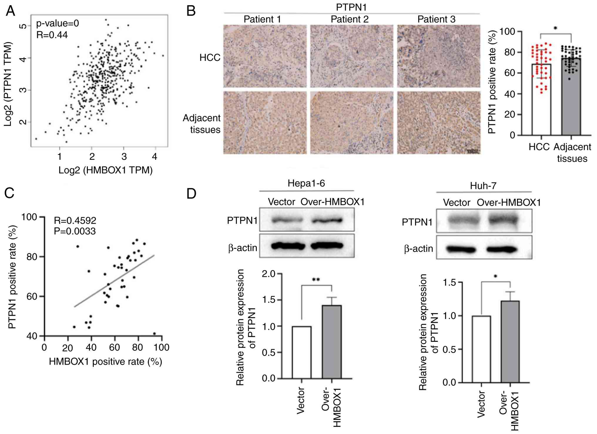 HCC tissue chips (cat. no. D097Lv01; Bioaitech®; http://www.bioaitech.com/) containing tumor and matched adjacent non-tumor tissues from 48 patients with HCC were used to evaluate the expression levels of HMBOX1 and PTPN1. The use of the tissue chips was approved by the Ethics Committee of Shandong First Medical University (approval no. R202403040155; Jinan, China). For immunohistochemical staining, the tissue chips were incubated at 60°C for 30–60 min and then subjected to deparaffinization. Briefly, the slides were incubated in xylene twice for 10 min each to completely dissolve the paraffin. Subsequently, the slides were rehydrated through a graded ethanol series: 100% ethanol twice for 5 min each, followed by 95% ethanol for 5 min, 80% ethanol for 5 min and finally 70% ethanol for 5 min. After rehydration, the slides were rinsed thoroughly in water for 5 min. Repaired the antigen with citric acid and then blocked the endogenous peroxidase activity with 3% H2O2-methanol. After incubation with anti-HMBOX1 (1:200; cat. no. 16123-1-AP) or anti-PTPN1 (1:200; cat. no. 11334-1-AP; both from Proteintech Group, Inc.) at 4°C for 16 h and secondary antibodies (1:50; cat. no. A0208; Beyotime Institute of Biotechnology), streptavidin-peroxidase was added dropwise. Images were captured under bright-field illumination using an upright microscope (BX53; Olympus Corporation) to analyze the positivity rate, and the expression of HMBOX1 and PTPN1 was compared between the patient's liver cancer tissue and adjacent tissues.