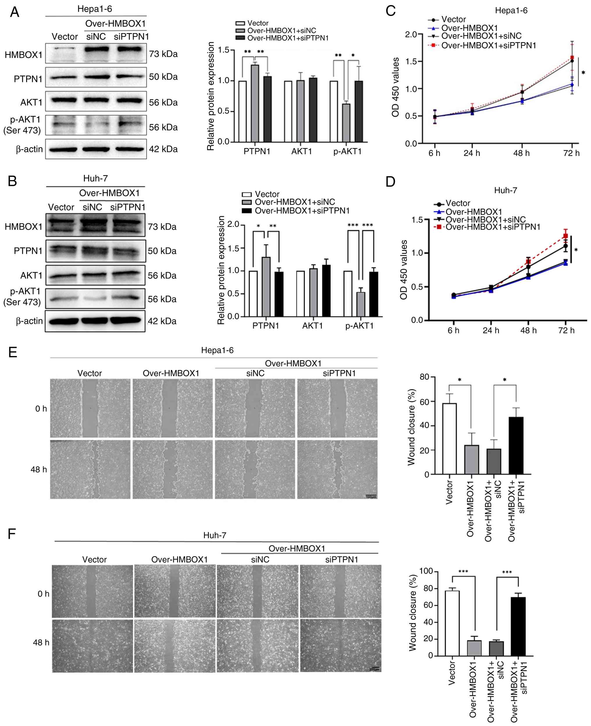 Building on previous findings that HMBOX1 inhibits AKT1 phosphorylation and that PTPN1 may act as a downstream regulator of HMBOX1, it was hypothesized that HMBOX1 may further regulate the phosphorylation of AKT1 by modulating the expression of PTPN1, which may contribute to the oncogenic suppression activity of HMBOX1. To confirm the regulatory relationship between PTPN1 and AKT1, PTPN1 was silenced in HMBOX1-overexpressing HCC cells using siRNA targeting PTPN1 (Fig. S2D and E) and it was found that silencing of PTPN1 reversed the downregulation of AKT1 phosphorylation caused by the overexpression of HMBOX1 (Fig. 5A and B). Further functional studies showed that silencing PTPN1 significantly restored the effect of HMBOX1 overexpression on tumor cell proliferation and migration (Fig. 5C-F).