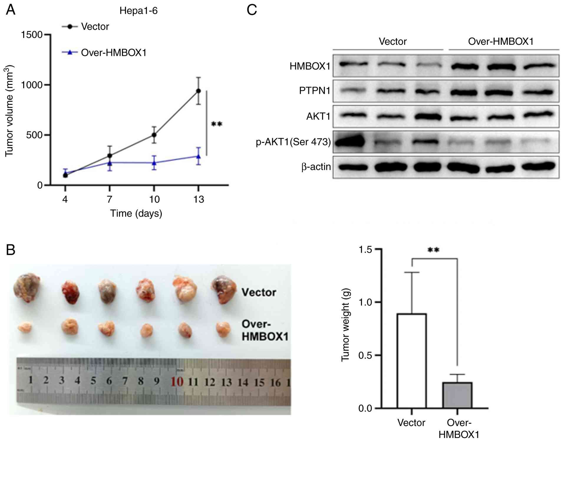 To further demonstrate the antitumor effect of HMBOX1 in vivo, a subcutaneous tumor model was established using HMBOX1-overexpressing (Over-HMBOX1) and control (Vector) Hepa1-6 cells in mice of the same strain. It was found that HMBOX1 overexpression significantly inhibited the growth of subcutaneous tumors in tumor-bearing mice (Fig. 6A and B). The expression of related markers in tumor tissues was analyzed, and it was found that HMBOX1 overexpression promoted PTPN1 expression and inhibited AKT1 phosphorylation (Fig. 6C). Taken together, these results indicated that HMBOX1 plays a vital role in the antitumor effects of HCC by regulating the PTPN1/AKT pathway.