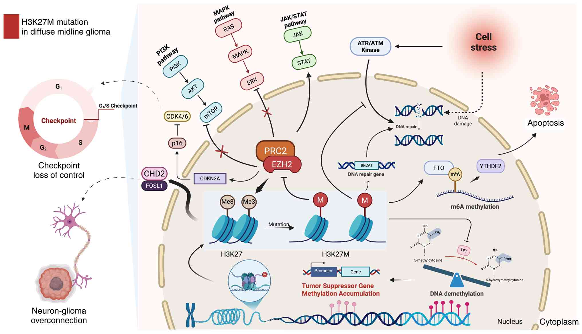 The H3K27M mutation disrupts cell cycle regulation by inhibiting the activity of the PRC2 complex and silencing tumor suppressor genes such as RB1 and CDKN2A. This leads to the loss of G1/S checkpoint control, allowing cells to bypass critical regulatory mechanisms and proliferate uncontrollably (56) (Fig. 1).