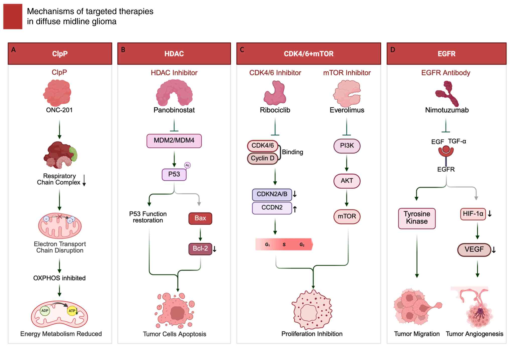 Targeted therapy for diffuse midline glioma aims to exploit actionable biological dependencies that sustain tumor growth. Current strategies include mitochondrial stress-based approaches centered on caseinolytic protease P (ClpP)/imipridones such as ONC201, epigenetic modulation such as HDAC inhibitors, panobinostat for epigenetic regulation and combination therapies targeting CDK4/6 and mTOR and receptor-directed interventions focusing on EGFR inhibition. These modalities are being evaluated to counteract core metabolic/epigenetic vulnerabilities and aberrant signaling programs in DMG (Fig. 2; Table I).
