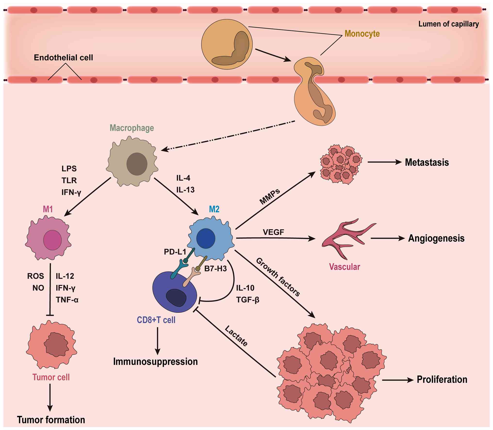 Based on functional characteristics, TAMs are typically classified into pro-inflammatory M1 and anti-inflammatory M2 phenotypes. M1 macrophages, activated by IFN-γ, lipopolysaccharide or Toll-like receptor ligands, express markers such as major histocompatibility complex (MHC)-II, CD68, CD80 and CD86. They enhance anti-tumor immune responses through secretion of cytokines including IL-12, TNF-α and IFN-γ, and directly exert cytotoxic effects on tumor cells via reactive oxygen species and nitric oxide (NO) production (15–19). Conversely, M2 macrophages exhibit immunosuppressive roles, expressing inhibitory receptors such as programmed death-ligand 1 (PD-L1) and B7-H3 (20–22). Activated by Th2 cytokines IL-4 and IL-13, M2 macrophages express CD163, CD206 and ARG1, and secrete cytokines such as IL-10, TGF-β and VEGF, suppressing T cell activity, promoting angiogenesis and facilitating immune escape (Fig. 2) (23–25).
