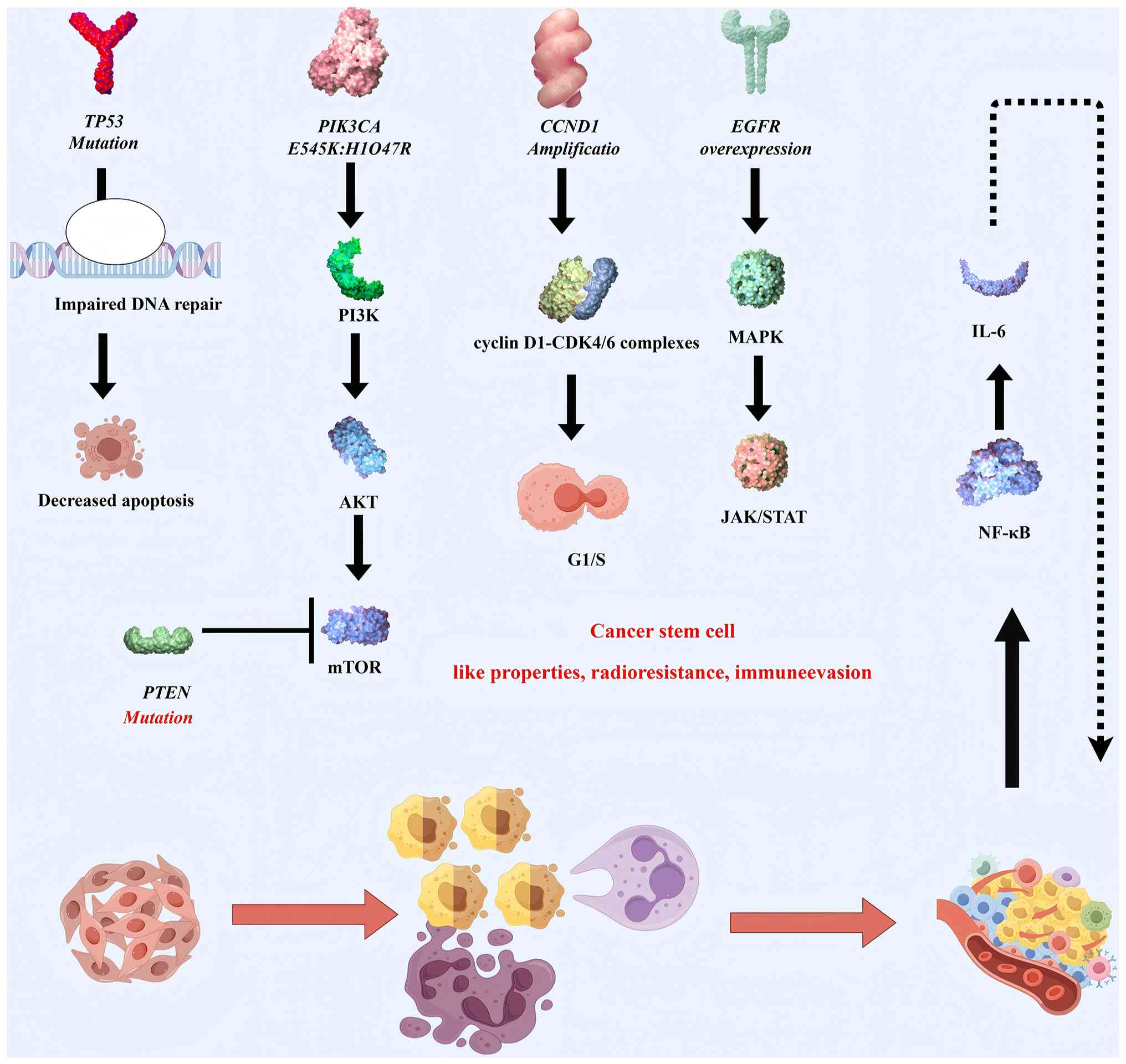 Of note, the immunogenetic predisposition of NPC reveals an evolutionary arms race between viral persistence and host immunity: Genome-wide association studies implicate human leukocyte antigen A/B (HLA-A/B) class I allele variants in defective EBV antigen presentation, compromising cytotoxic T-cell surveillance and enabling viral oncogene-mediated transformation (53–55). The synergistic interplay between these cell-intrinsic (CCND1/CDKN2A axis) and cell-extrinsic (NF-κB-inflammatory loop) drivers, superimposed upon (HLA)-restricted immune evasion mechanisms, defines the landscape of the molecular heterogeneity of NPC. Such integrative molecular cartography not only elucidates the biological basis of the distinct clinical behavior of NPC but also informs precision therapeutics, exemplified by the combinatorial targeting of PI3K/AKT and EGFR axes that converge on dysregulated growth factor signaling. This multi-layered mechanistic dissection positions NPC as a paradigm for viro-immunogenetic tumor models requiring context-specific therapeutic interventions (Fig. 2).