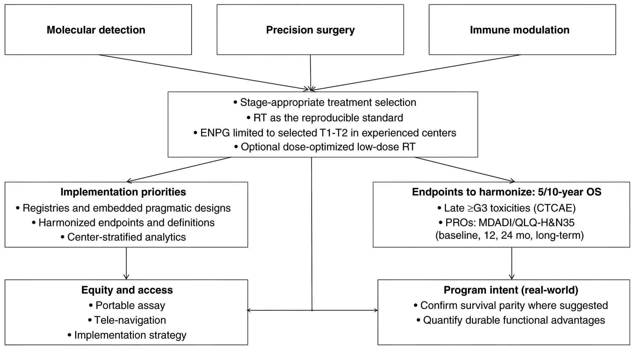Looking ahead, the field will hinge on harmonising precision detection with targeted intervention to shift care upstream. Artificial intelligence-assisted models that fuse multi-omics [including circulating tumor DNA (ctDNA)], immune-repertoire signatures and radiomic biomarkers can refine dynamic risk stratification and flag pre-clinical disease. In parallel, rational sequencing, for example, protocol-guided programmed cell death protein 1 (PD-1)/programmed death ligand 1 (PD-L1) strategies alongside indication-bounded ENPG, may sustain oncologic control while preserving function in selected patients. Progress will depend on multi-center prospective programs with harmonized endpoints [5/10-year OS; late ≥G3 toxicities and PROs such as M.D. Anderson dysphagia inventory (MDADI)/quality of life questionnaire-head and neck module (QLQ-H&N35)], and on equitable implementation via portable diagnostics and tele-enabled expertise in endemic regions where the burden is greatest.