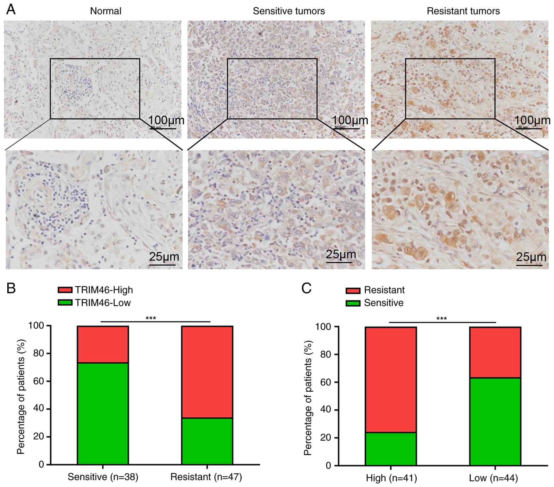 The function of TRIM46 was investigated by first determining whether TRIM46 expression was associated with DDP resistance in human samples. The immunohistochemical staining results of the TMA showed that the TRIM46 level was elevated in NSCLC tissues compared with normal tissues. Moreover, TRIM46 expression further increased in DDP-resistant tissues compared with DDP-sensitive tissues (Fig. 1A and B). The association between TRIM46 and DDP resistance was explored by dividing the patients into two groups based on low or high TRIM46 expression. It was found that the number of resistant tissues significantly increased in the high-TRIM46-expression group compared with the low-TRIM46-expression group (Fig. 1C). These results indicated that TRIM46 expression may be associated with DDP resistance in NSCLC tissues.