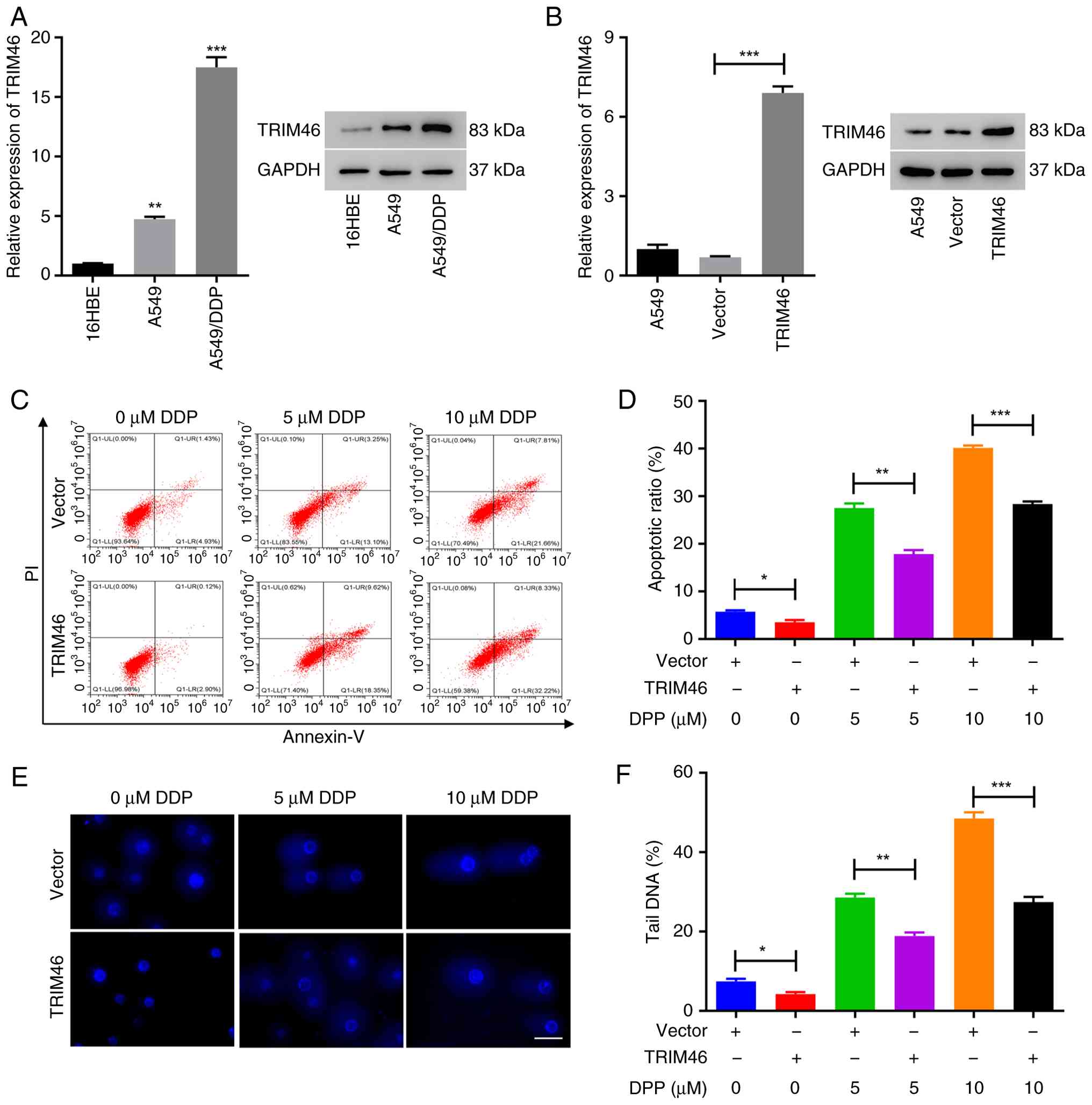 TRIM46 expression in bronchial epithelial cells (16HBE) and DDP-sensitive (A549) and DDP-resistant (A549/DDP) NSCLC cells was measured to explore the involvement of TRIM46 in DDP resistance. As shown in Fig. 2A, the TRIM46 level was significantly elevated in NSCLC cells compared with 16HBE cells. Furthermore, TRIM46 expression was significantly upregulated in A549/DDP cells compared with A549 cells, indicating the possible involvement of TRIM46 in DDP resistance. A549 cells were infected with blank lentivirus or TRIM46-overexpressing lentivirus to directly determine the effect of TRIM46 on DDP resistance. The results revealed that TRIM46 expression was significantly upregulated at both the mRNA and protein levels upon infection with TRIM46-overexpressing lentivirus (Fig. 2B). As shown in Fig. 2C and D, DDP induced the apoptosis of A549 cells in a concentration-dependent manner. However, TRIM46 overexpression significantly suppressed the apoptosis induced by DDP in A549 cells. Furthermore, the comet assay was employed to investigate whether TRIM46 was related to DNA damage. The formation of a ‘comet’ in the DNA of cells can be visualized using single-cell gel electrophoresis and indicates DNA strand breaks as the damaged DNA migrates at a different rate than the non-damaged DNA. The results demonstrated an increase in the percentage of tail DNA in DDP-treated A549 cells compared with the control group. However, TRIM46 overexpression showed a decrease in the percentage of tail DNA in A549 cells treated with DDP (Fig. 2E and F). These results indicated that TRIM46 alleviated DNA damage and the cell apoptosis of A549 cells treated with DDP.
