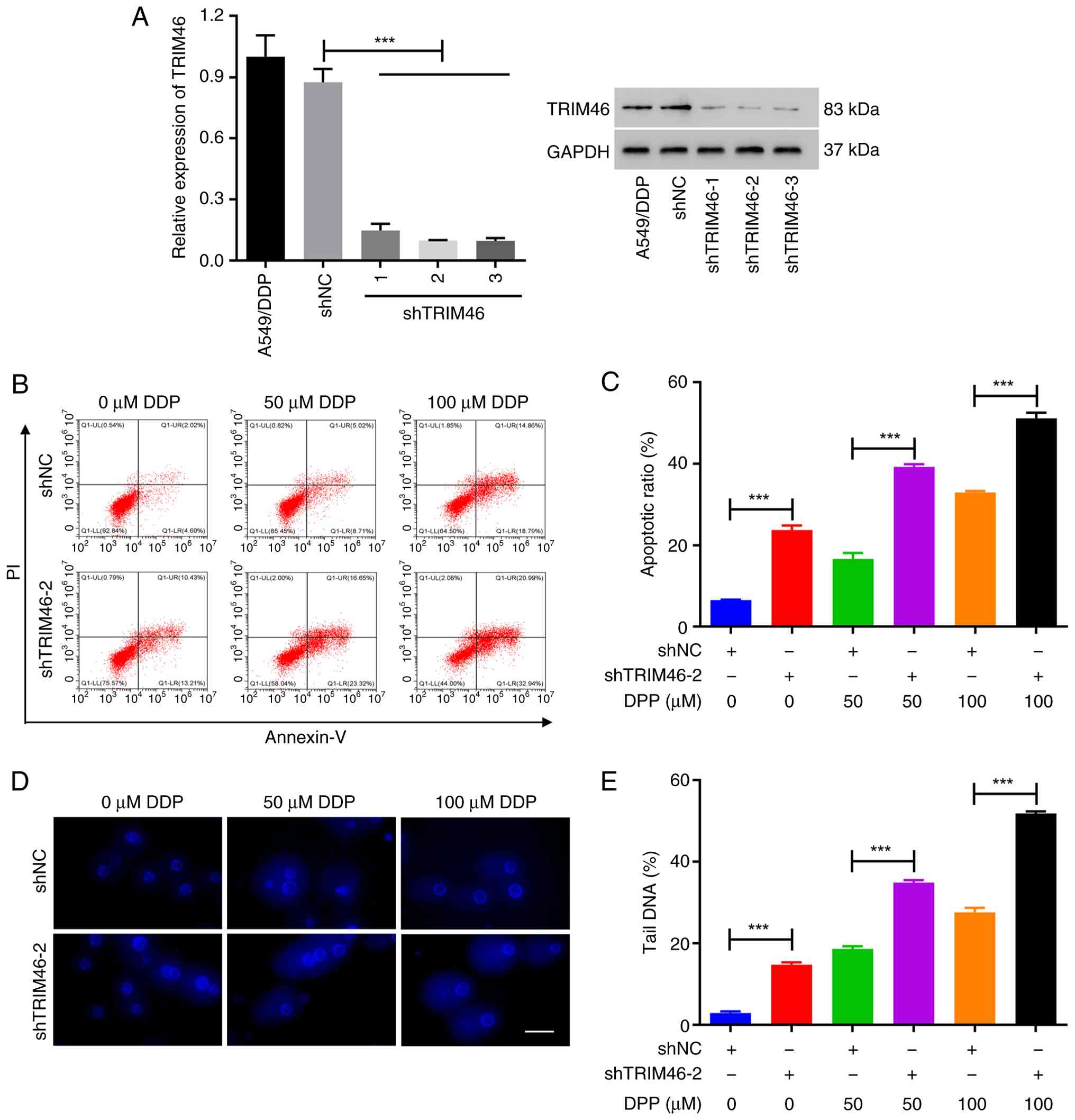 The function of TRIM46 was further explored using lentiviruses to knock down its expression in A549/DDP cells. As expected, all three lentiviruses significantly decreased TRIM46 expression, and the knockdown efficiency of shTRIM46-2 was the most significant (Fig. 3A). Knockdown of TRIM46 using shTRIM46-2 lentivirus promoted the apoptosis of A549/DDP cells treated with or without DDP (Fig. 3B and C). Meanwhile, the comet assay results also showed that TRIM46 knockdown significantly enhanced DNA damage in A549/DDP cells treated with DDP (Fig. 3D and E).