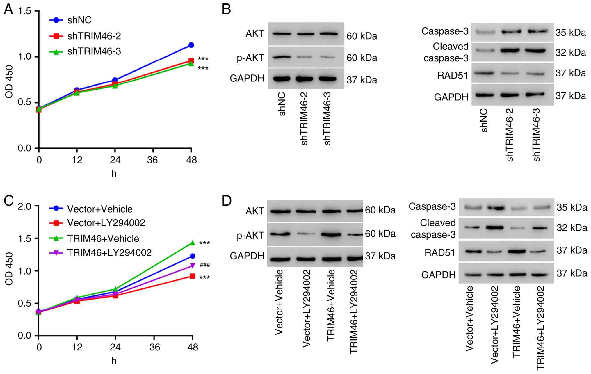Cell proliferation was detected in the A549/DDP cells transduced with shTRIM46-2 and shTRIM46-3. The results showed that TRIM46 depletion effectively reduced the proliferation of A549/DDP cells (Fig. 4A). The protein levels of p-Akt (Ser 473) were measured to elucidate the role of TRIM46. It was found that TRIM46 knockdown resulted in a significant decrease in the level of p-Akt (Fig. 4B). Based on the aforementioned result depicted in Fig. 3, where TRIM46 depletion induced DNA damage, the expression of RAD51, a key protein involved in DNA repair, was further detected. As shown in Fig. 4B, TRIM46 knockdown not only decreased the protein level of RAD51 but also increased the protein levels of caspase 3 and cleaved-caspase 3 in A549/DDP cells. These findings collectively indicated that TRIM46 knockdown induced DNA damage, thereby suppressing cell proliferation. The Akt pathway is involved in regulating cell behaviors such as proliferation and apoptosis; it also plays an important role in DNA damage repair (16,17). To examine the role of the Akt pathway in regulating TRIM46-mediated DDP resistance, LY294002, an inhibitor of Akt, was applied to A549 cells infected with TRIM46-overexpression lentivirus. The CCK-8 assay results showed that TRIM46 overexpression significantly enhanced the proliferation of A549 cells compared with the vector-transfected group. Moreover, the promotive effect of cell proliferation induced by TRIM46 overexpression was alleviated by LY294002 (Fig. 4C). As shown in Fig. 4D, LY294002 treatment decreased the p-Akt level and also partially blocked the increase in p-Akt level caused by TRIM46 overexpression. Moreover, LY294002 treatment effectively alleviated the increase in RAD51 level and the decrease in the levels of caspase 3 and cleaved-caspase3 induced by TRIM46 overexpression in A549 cells. Taken together, these findings emphasized that TRIM46 knockdown may induce DNA damage by regulating the Akt signaling pathway, thereby inhibiting the proliferation of NSCLC cells.