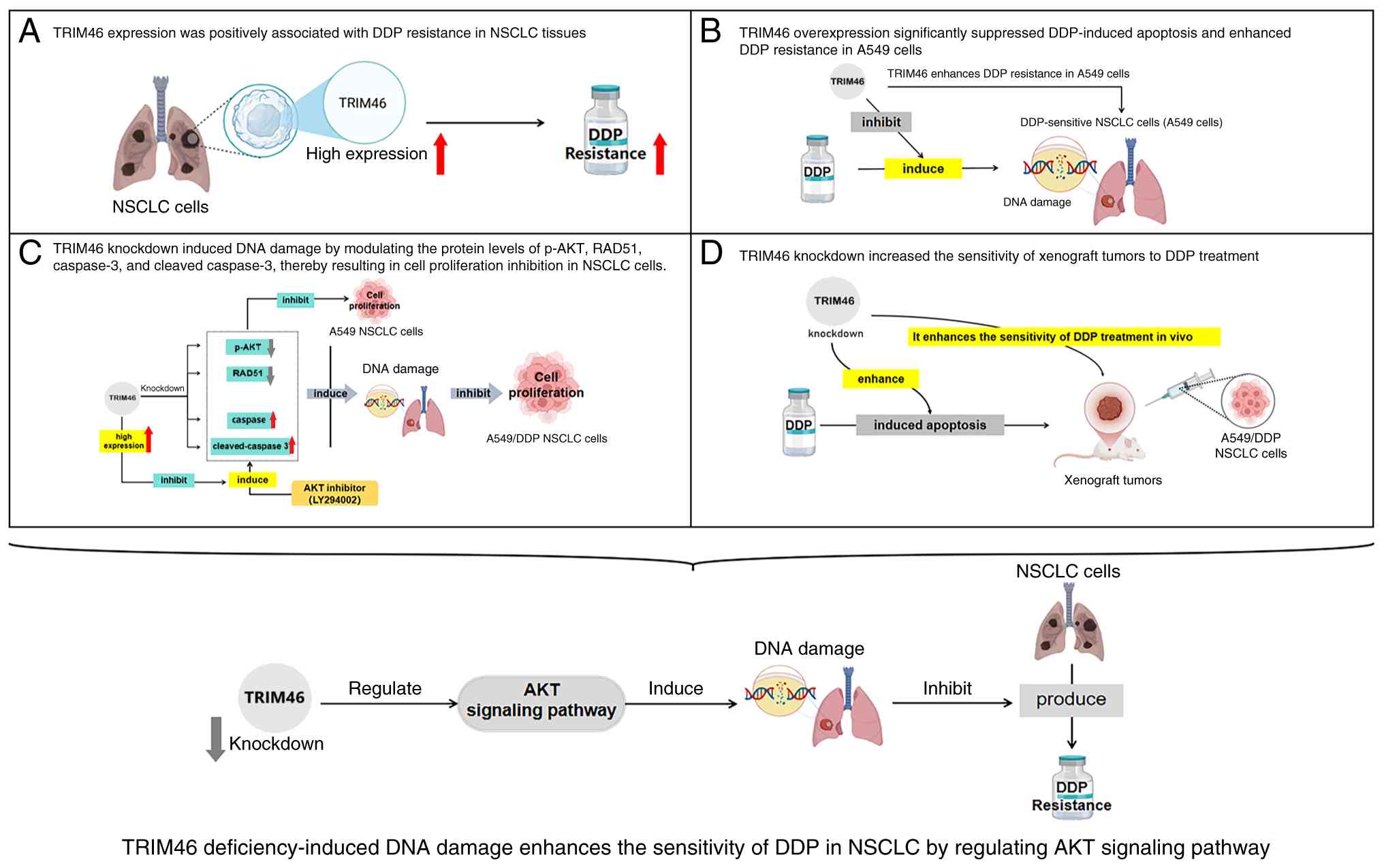 The present study revealed that TRIM46 could act as a positive regulator of DDP resistance in NSCLC via activating Akt and reducing DNA damage. Targeting TRIM46, potentially through small-molecule inhibitors or RNA interference-based strategies (such as small interfering RNA or shRNA delivery via nanocarriers), could sensitize resistant tumors to conventional DDP chemotherapy. Combining TRIM46 inhibition with Akt pathway inhibitors might represent a particularly effective synergistic strategy, as suggested by the results using LY294002. However, this warrants further investigation.