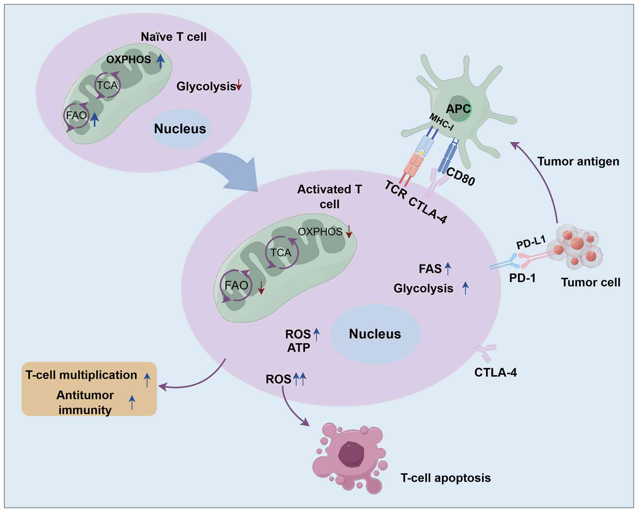 Memory CD8+ T cells exhibit long-term survival in the body through FAO; upon re-encountering the same antigen, mitochondrial metabolism involving FAO and OXPHOS is increased to support the rapid proliferation of memory T cells, and mitochondrial morphology transforms from fragmented to fused, with tightly packed cristae and higher metabolic efficiency. Exhausted T cells exhibit decreased mitochondrial quality and function, reduced glucose uptake, and lowered levels of glycolysis and OXPHOS (44). Some T cells enhance FAO by increasing AMPK activity or inhibiting mTOR to participate in the transition from an effector to a memory state (45). T-cell activation is illustrated in Fig. 1.