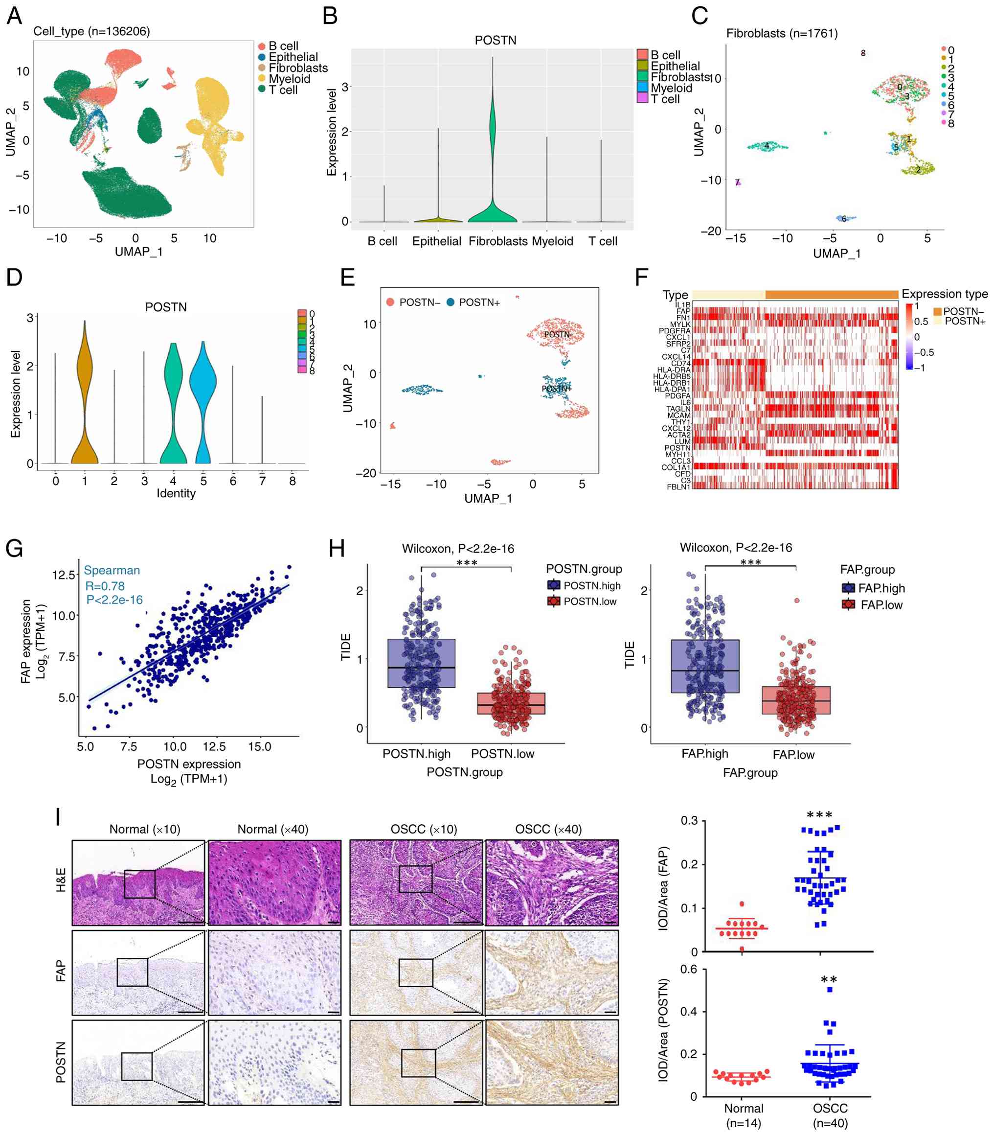 An integrated analysis of the HNSCC single-cell profiling data was conducted using sequencing datasets (Fig. 1A), revealing five clusters that were annotated via Seurat clustering according to specific markers. The gene lists associated with cluster annotation markers are included in Table SI. Existing studies have revealed that POSTN is markedly elevated in tumor-derived fibroblasts compared with in normal tissues (37,44,45). The vlnplot demonstrated that POSTN was mainly expressed in the fibroblasts cluster (Fig. 1B). Subsequently, the fibroblasts were further re-clustered into nine clusters (Fig. 1C) and it was revealed that POSTN was expressed in subpopulations 1, 4 and 5, with its expression was predominantly enriched in subpopulation 1 (Fig. 1D). To determine whether POSTN was expressed in M1/M2 macrophages, the myeloid cluster was further re-clustered into 14 subtypes. Low POSTN expression was detected in five of these subpopulations and it was negligible in the others (Fig. S1A). Based on established biomarkers (Table SII), these subpopulations were categorized into M1-like and M2-like macrophages (Fig. S1B). Notably, low expression of POSTN was present in M1-like macrophages and it was barely detectably in M2-like macrophages (Fig. S1C). Based on UMAP clustering analysis, the fibroblast subpopulations were categorized into POSTN− and POSTN+ fibroblasts (Fig. 1E). Heatmap analysis revealed that myofibroblastic CAF (myCAF)-related proteins (ACTA2, MYH11, TAGLN, PDGFA, MCAM and MYLK) and inflammatory CAF (iCAF)-related proteins (IL6, CXCL12, C3 and CFD) were predominantly expressed in POSTN− fibroblasts. By contrast, ECM CAF (eCAF)-related proteins (FAP, FN1, SFRP2, THY1, COL1A1, FBLN1 and LUM) and antigen presenting CAF (apCAF)-related proteins (CD74, HLA-DRA, HLA-DRB5, HLA-DRB1 and HLA-DPA1) were predominantly expressed in POSTN+ fibroblasts (Fig. 1F). Vnplots further illustrated the expression levels of eCAF and apCAF-associated proteins in POSTN+ fibroblasts and POSTN− fibroblasts (Fig. S1D). Spearman's correlation analysis revealed a significant correlation between the expression levels of POSTN and FAP (Fig. 1G). Moreover, patients with POSTNhigh and FAPhigh HNSCC exhibited a high poor response to ICB (Fig. 1H). The clinical parameters of 40 OSCC cases and 14 normal controls are listed in Table SIII. H&E and immunohistochemical staining identified higher expression levels of FAP and POSTN in the stroma of OSCC cases compared with those in the normal control samples (Fig. 1I). These findings indicated that POSTN+FAP+ fibroblasts are localized in the stromal region and associated with a poor response to ICB in patients with HNSCC.