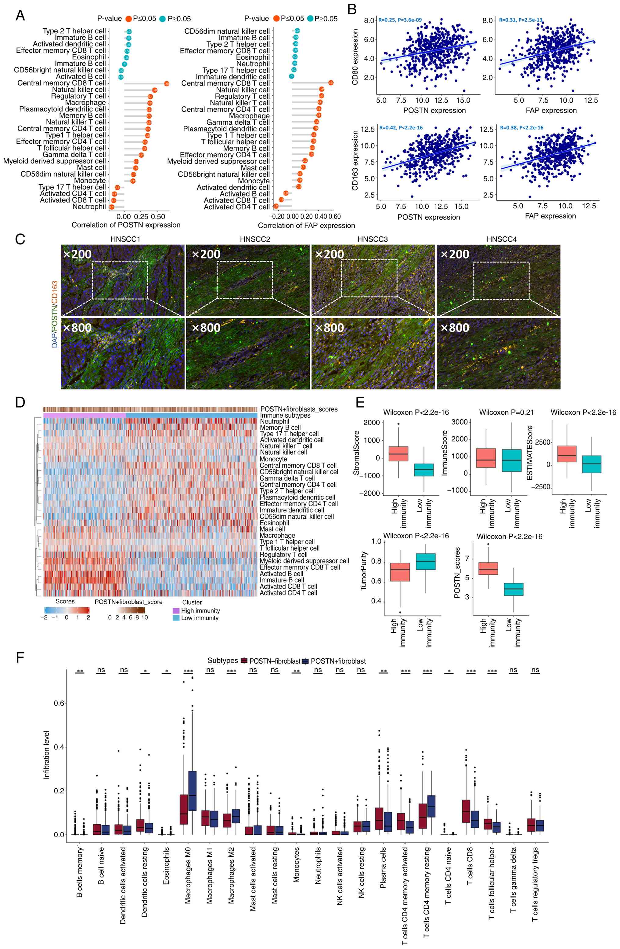 CAFs recruit monocytes and promote their differentiation into M2-like TAMs through various factors, including cytokines (CXCL12, CCL5, IL-6 and IL-33) and the glycoprotein chitinase 3-like-1 (76–78). In particular, POSTN+ fibroblasts attract and polarize macrophages into an SPP1+ TAM phenotype via the IL-6/STAT3 signaling pathway. This process hinders effective T-cell infiltration and diminishes immunotherapy response (31). Consequently, patients exhibiting high co-expression of POSTN+ fibroblasts and SPP1+ macrophages demonstrate poorer outcomes in immunotherapy cohorts (31). The present analysis of TCGA-HNSCC data revealed that the expression of POSTN and FAP was markedly positively associated with M1 macrophage markers (CD80 and CD86) and M2 macrophage markers (CD163 and CD206). This notable finding led to the hypothesis that POSTN may actively modulate M1 macrophages polarization, raising a critical question for further research. Immunofluorescence staining revealed the co-expression of POSTN and CD163 in the stromal area of HNSCC cases, suggesting a potential interaction within the TME. It should be noted that preliminary analysis was performed on four representative samples. Future studies with larger sample sizes are warranted to confirm and extend these findings.