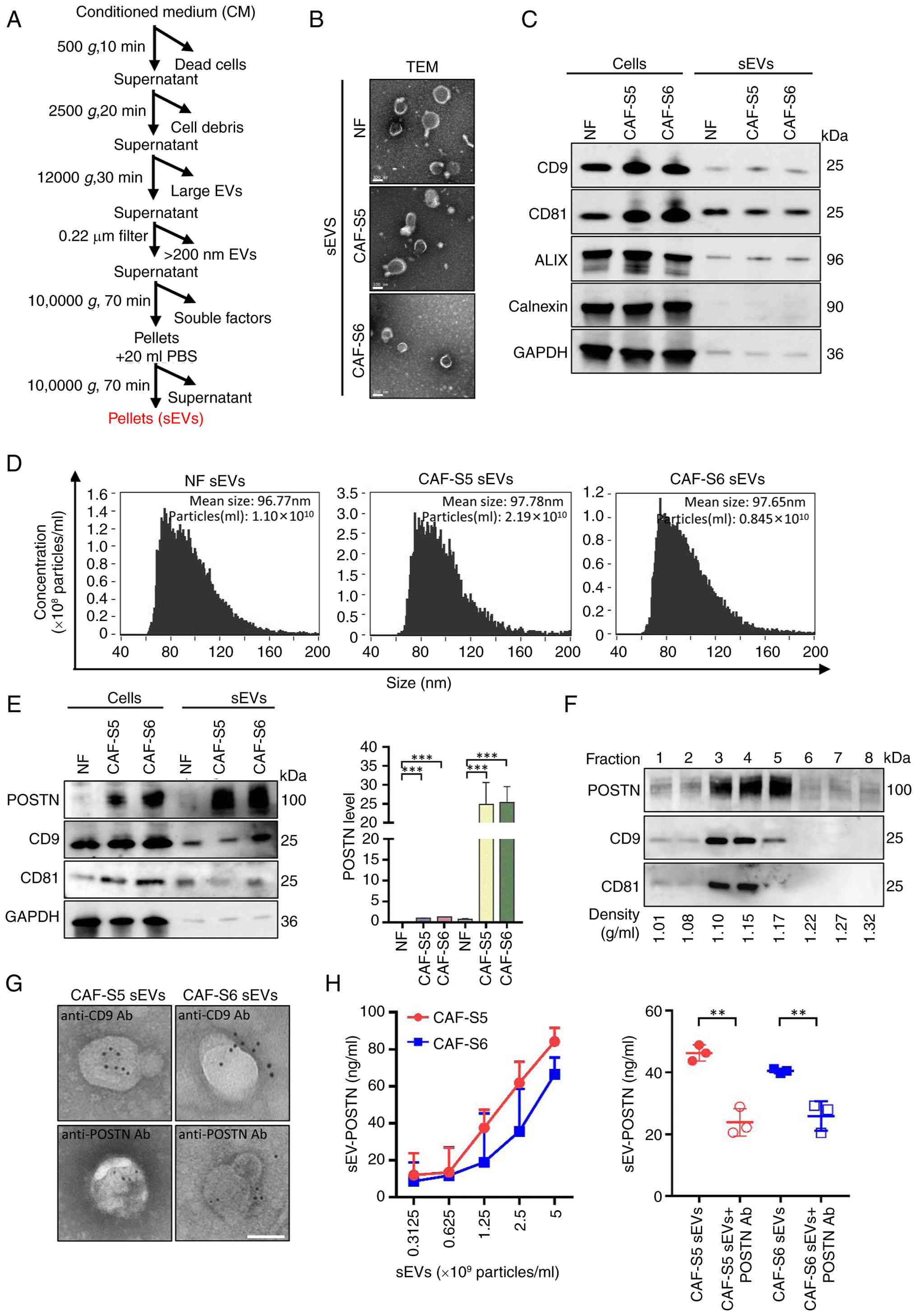 For POSTN blocking on the sEV surface, CAF sEVs were incubated overnight at 4°C with a POSTN-blocking antibody (10 µg/ml in 100 µl PBS; Abcam). Non-bound antibodies were removed by washing with 20 ml PBS and ultracentrifugation at 100,000 × g at 4°C for 70 min. All experiments were performed in at least triplicate.